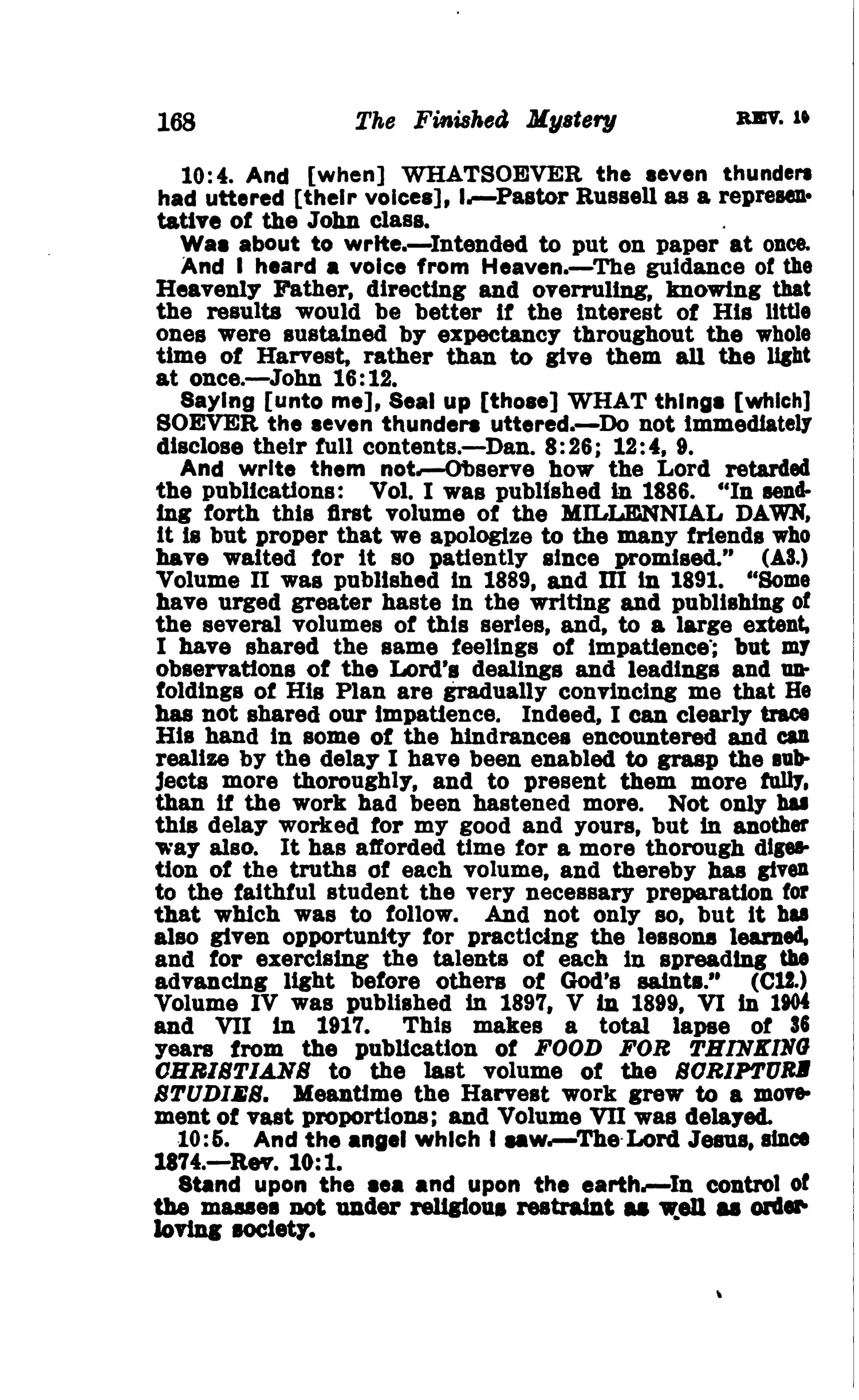 And [when] WHATSOEVER the seven thunden had uttered [their voices], I. — Pastor Russell as a representative of the John class. Was about to write. — Intended to put on paper at once. And I heard a voice from Heaven. — The guidance of the Heavenly Father, directing and overruling, knowing that the results would be better If the Interest of His little ones were sustained by expectancy throughout the whole time of Harvest, rather than to give them all the light at once.—John 16:12. Saying [unto me], Seal up [those] WHAT things [which] SOEVER the seven thunders uttered. — Do not immediately disclose their full contents.—Dan. 8:26; 12:4, 9. And write them not. — Observe how the Lord retarded the publications: Vol. I was published In 1886. "In sending forth this first volume of the MILLENNIAL. DAWN, It is but proper that we apologize to the many friends who have waited for It so patiently since promised." (A3.) Volume II was published In 1889, and m in 1891 "Some have urged greater haste In the writing and publishing of the several volumes of this series, and, to a large extent. I have shared the same feelings of Impatience; but my observations of the Lord's dealings and leadings and unfoldings of His Plan are gradually convincing me that He has not shared our impatience. Indeed, I can clearly trace His hand in some of the hindrances encountered and can realize by the delay I have been enabled to grasp the subjects more thoroughly, and to present them more folly, than If the work had been hastened more. Not only has this delay worked for my good and yours, but in another way also. It has afforded time for a more thorough digestion of the truths of each volume, and thereby has given to the faithful student the very necessary preparation for that which was to follow. And not only so, but It has also given opportunity for practicing the lessons learned, and for exercising the talents of each In spreading the advancing light before others of God's saints." (C12-) Volume IV was published in 1897, V in 1899, VI in 1904 and VII In 1917. This makes a total lapse of 36 years from the publication of FOOD FOR THTNKING CHRISTIANS to the last volume of the SCRIPTURE STUDIES. Meantime the Harvest work grew to a movement of vast proportions; and Volume VII was delayed. Source : 🇺🇸 1917 - Studies in the Scriptures, Vol 7, The finished mystery, page 168 + Cover |