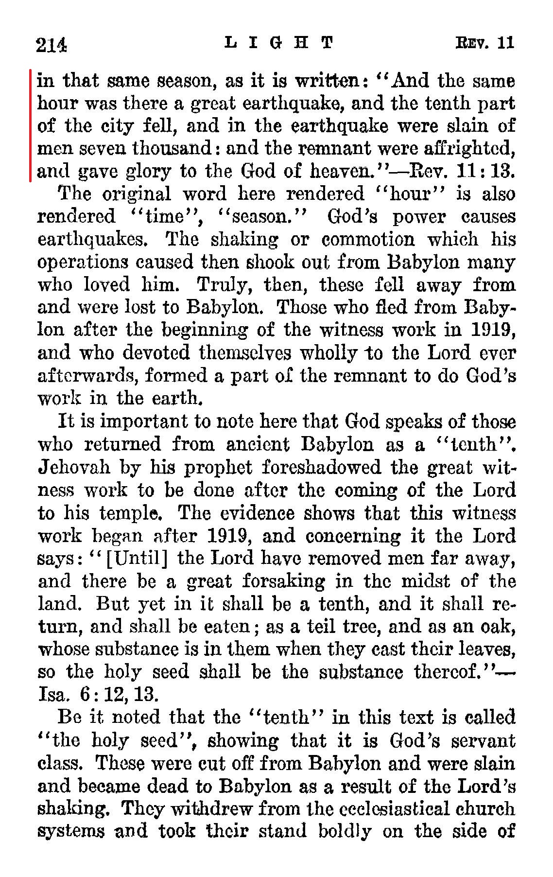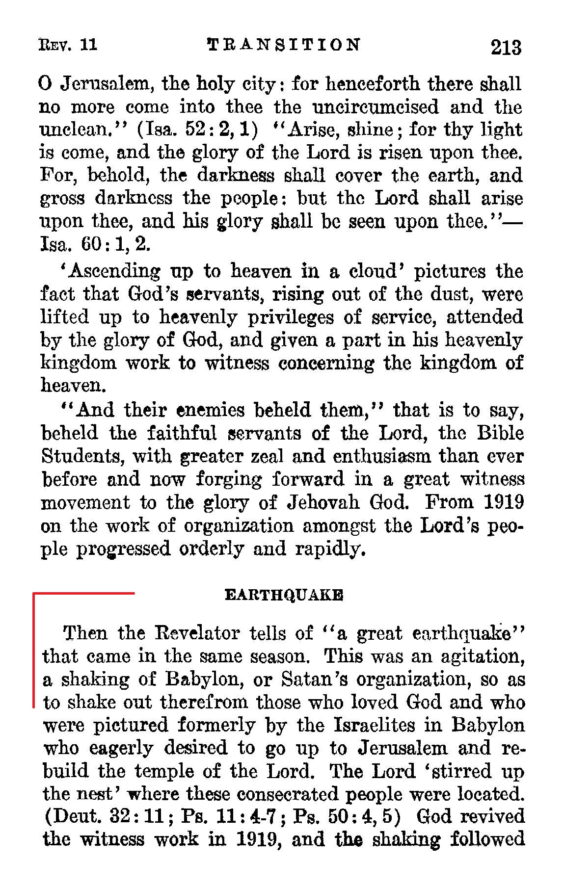 Then the Revelator tells of "a great earthquake" that came in the same season. This was an agitation, a shaking of Babylon, or Satan's organization, so as to shake out therefrom those who loved God and who were pictured formerly by the Israelites in Babylon who eagerly desired to go up to Jerusalem and rebuild the temple of the Lord. The Lord 'stirred up the nest' where these consecrated people were located. (Deut. 32:11 ; Ps. 11:4:-7 ; Ps, 50:4, 5) God revived the witness work in 1919, and the shaking followed in that same season, as it is written: "And the same hour was there a great earthquake, and the tenth part of the city fell, and in the earthquake were slain of men seven thousand: and the remnant were affrighted, and gave glory to the God of heaven." - Rev. 11:13. Source : 🇺🇸 1930 - Light, Vol 1, page 213, page 214 + Cover |