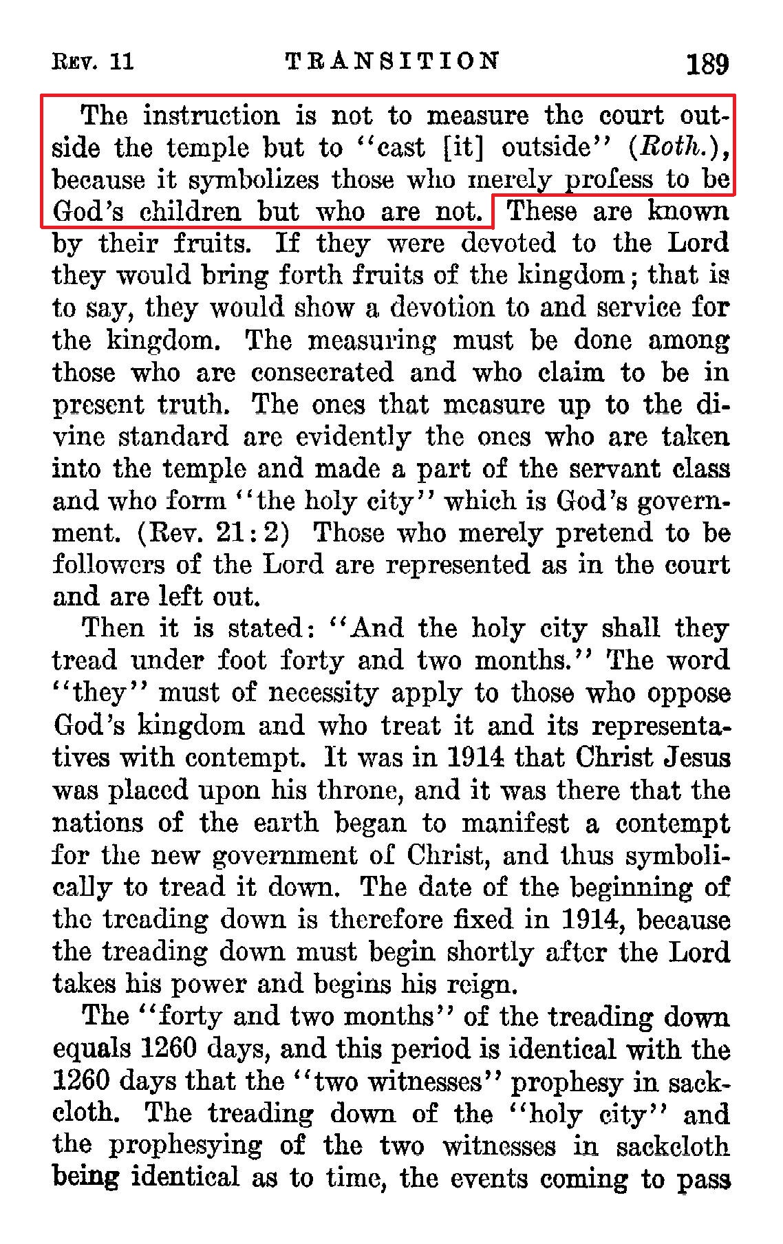 The instruction is not to measure the court outside the temple but to "cast [it] outside" (Roth.), because it symbolizes those who merely profess to be God's children but who are not. Source : 🇺🇸 1930 - Light, Vol 1, page 189 + Cover |