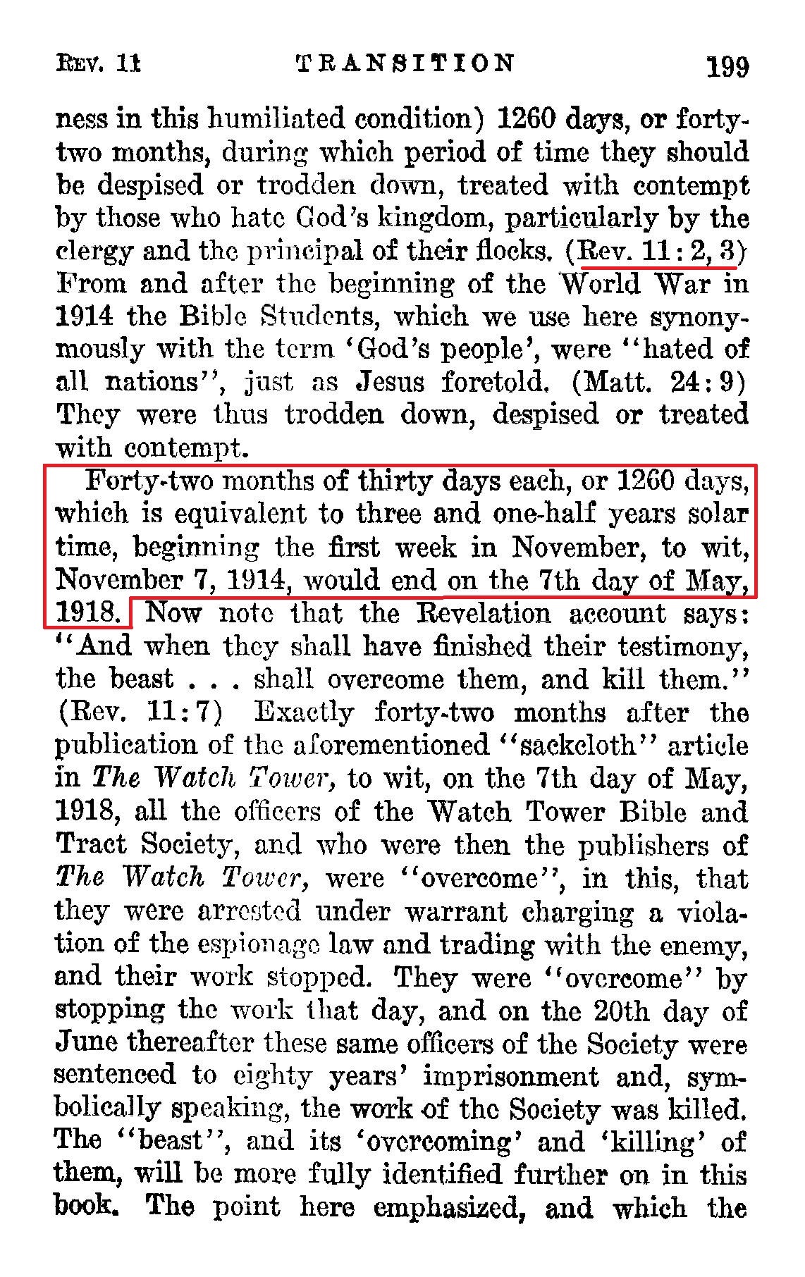 Now note further corroborative proof of this period of time: “I will cause my two witnesses to prophesy a thousand two hundred and sixty days dressed in sackcloth.” (Rev. 11:3, NW) [...] This 1,260-day period ('time, times and half a time') was fulfilled from October, 1914, to April, 1918, [...]