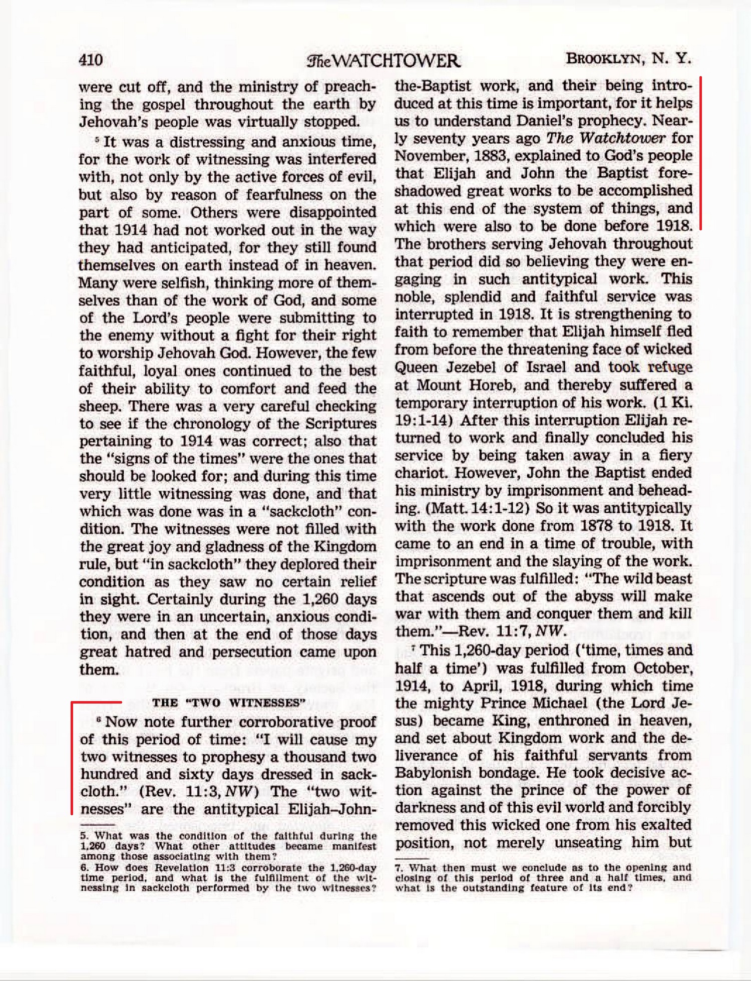 Now note further corroborative proof of this period of time: “I will cause my two witnesses to prophesy a thousand two hundred and sixty days dressed in sackcloth.” (Rev. 11:3, NW) The "two witnesses" are the antitypical Elijah-John-the-Baptist work, and their being introduced at this time is important, for it helps us to understand Daniel’s prophecy. Nearly seventy years ago The Watchtower for November, 1883, explained to God’s people that Elijah and John the Baptist foreshadowed great works to be accomplished at this end of the system of things, and which were also to be done before 1918. Source : 🇺🇸 The Watchtower, July 1 1951, page 410 + Cover |
