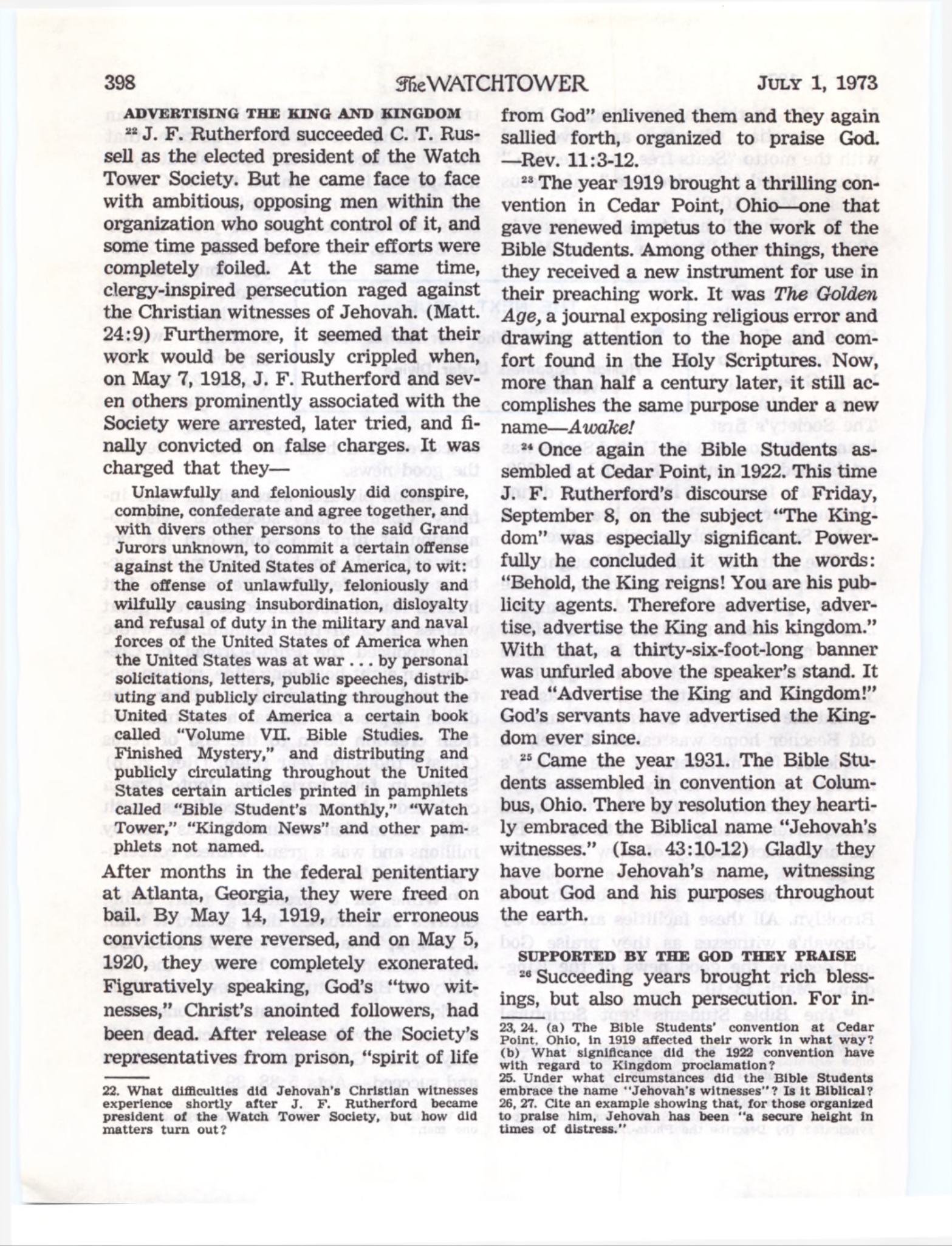 Source : 🇺🇸 The Watchtower, July 1 1973, page 398 + Cover |