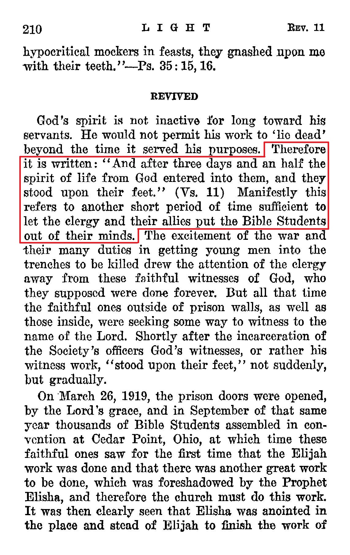 The "three days and an half" that their dead bodies lay in the streets does not seem to be either literal or symbolic time, but merely a time sufficient to cause a dead body to putrefy. [...] Therefore it is written: "And after three days and an half the spirit of life from God entered into them, and they stood upon their feet." (Vs, 11) Manifestly this refers to another short period of time sufficient to let the clergy and their allies put the Bible Students out of their minds. Source : 🇺🇸 1930 - Light, Vol 1, page 207, page 210 + Cover |