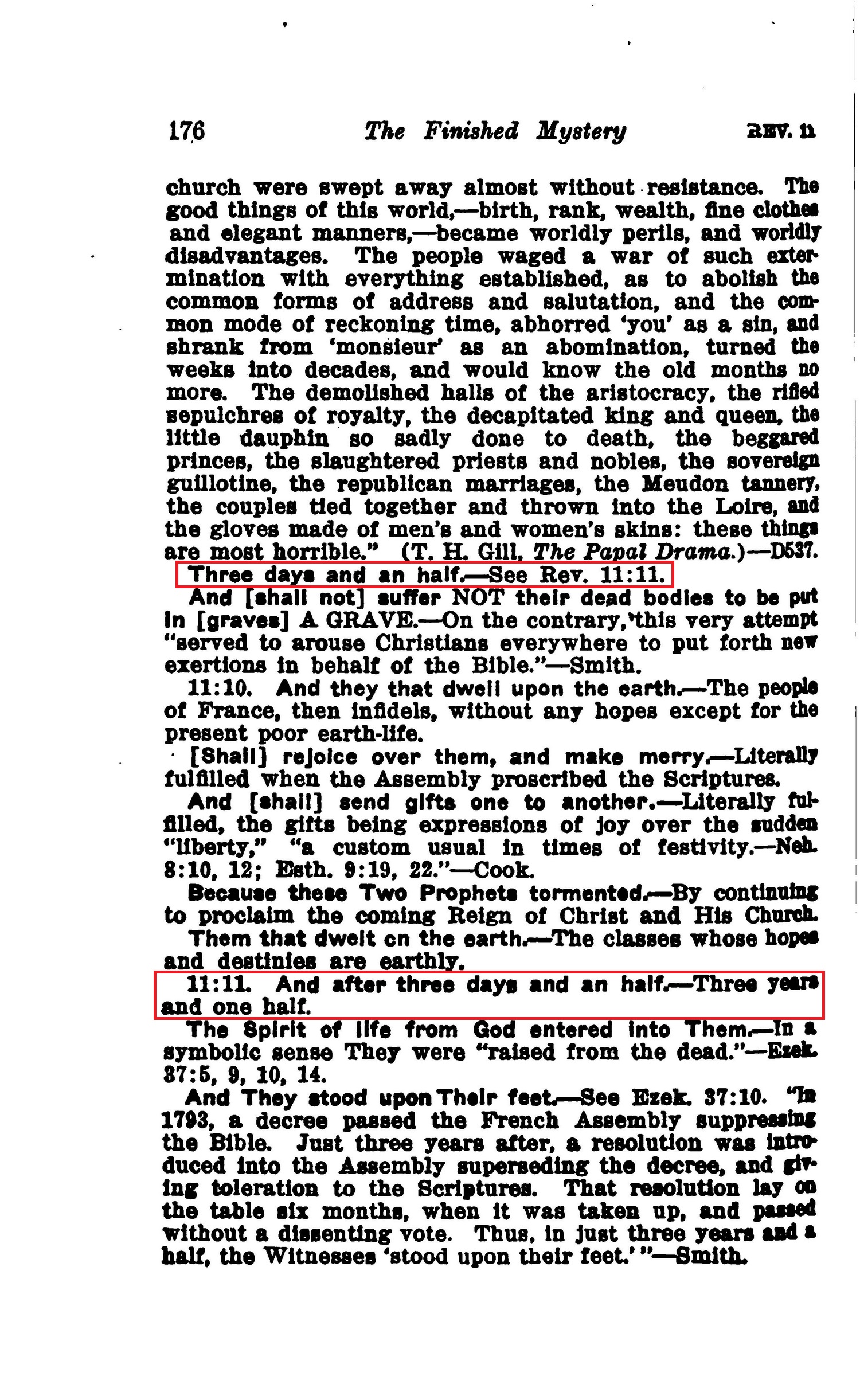 Three days and an half. — See Rev. 11:11. And [shall not] suffer NOT their dead bodies to be put In [graves] A GRAVE.— On the contrary, this very attempt "served to arouse Christians everywhere to put forth new exertions in behalf of the Bible." — Smith. [...] 11:11. And after three days and an half. — Three years and one half. Source : 🇺🇸 1917 - Studies in the Scriptures, Vol 7, The finished mystery, page 176 + Cover |