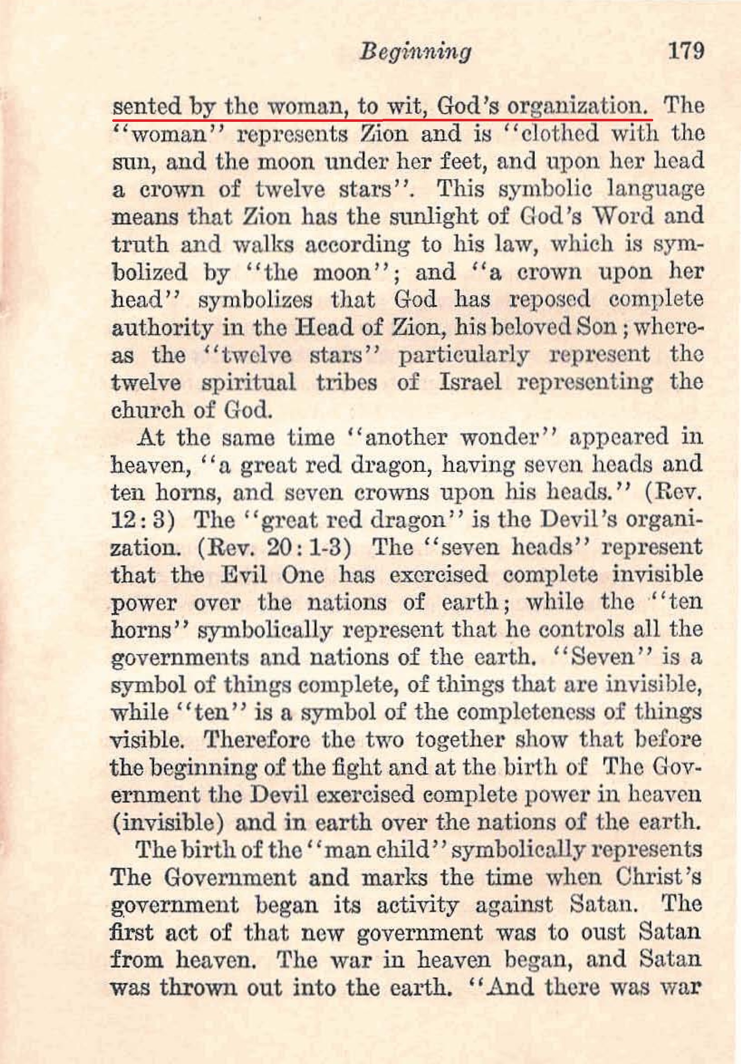 Corroborative proof is found in chapter twelve of Revelation. That book is written in symbolic phrase. There the word “woman” is used to symbolize Zion, which is God’s organization and which gives birth to the righteous government, which government is pictured under the symbol “man child”. [...] That does not mean that the Christians saw with their natural eyes ; but the faithful students of divine prophecy discerned the great wonder represented by the woman, to wit, God’s organization. The “woman” represents Zion and is “clothed with the sun, and the moon under her feet, and upon her head a crown of twelve stars”.