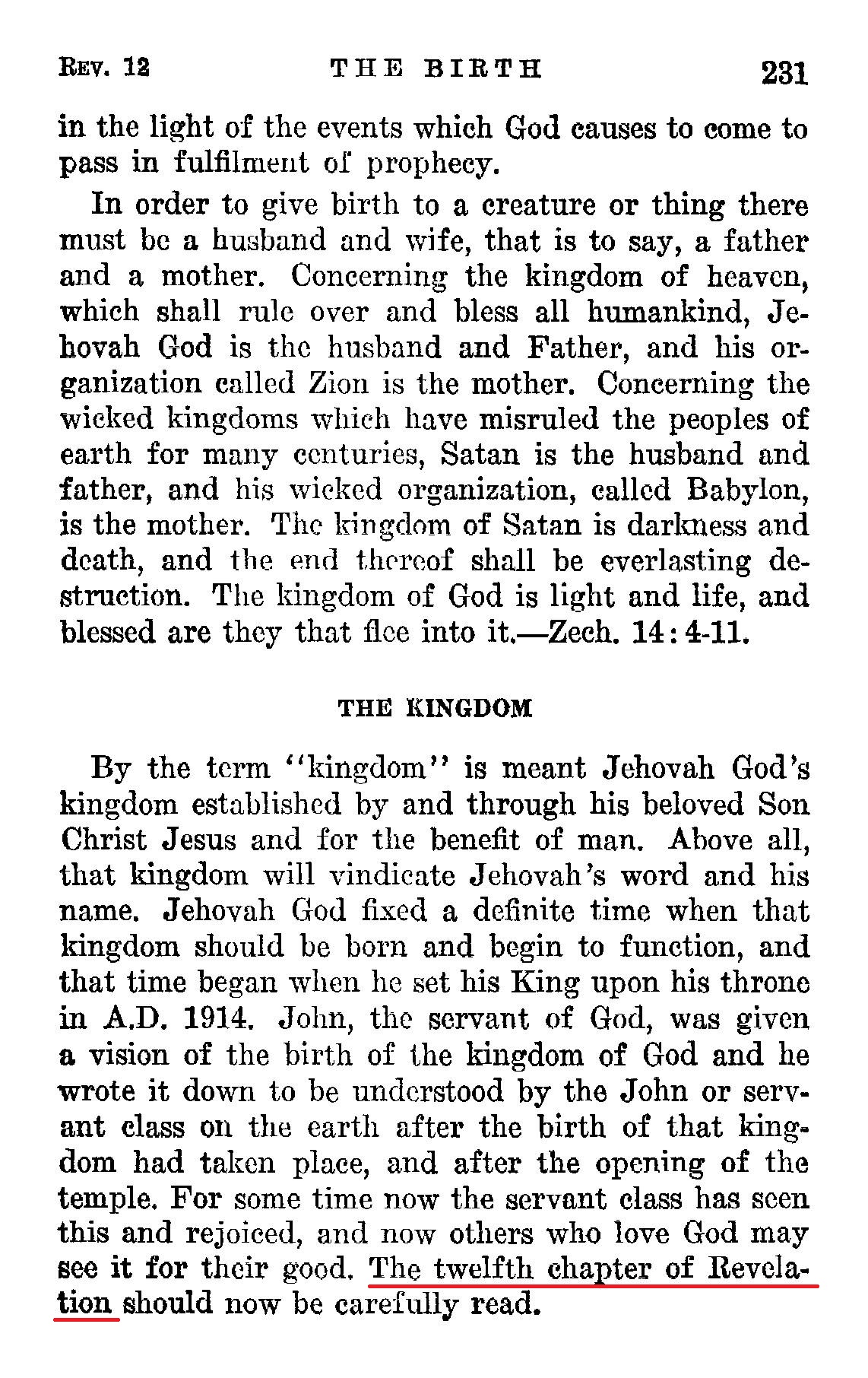 The twelfth chapter of Revelation should now be carefully read. Note that it opens with the statement: "And there appeared a great wonder in heaven." The Revised Version says: "A great sign was seen ill heaven." Truly it is a "great" sign, because of its importance. The kingdom or nation was born with the end of 1914, but this fact was not intelligently discerned by the people of Cod until some time after 1918. That great wonder or sign appearing in heaven is symbolized by "a woman clothed with the sun, and the moon under her fcot, ana upon her head a crown of twelve stars". That woman symbolically represents God's organization, otherwise named Zion. [...] God's organization, symbolized by the pure woman, is partially visible to man, but the greater part thereof is invisible to man. It includes his beloved Son and all the host of heavenly creatures in harmony with God, and it includes those on earth who are faithful and true to God. Source : 🇺🇸 1930 - Light, Vol 1, page 231, page 232 + Cover |