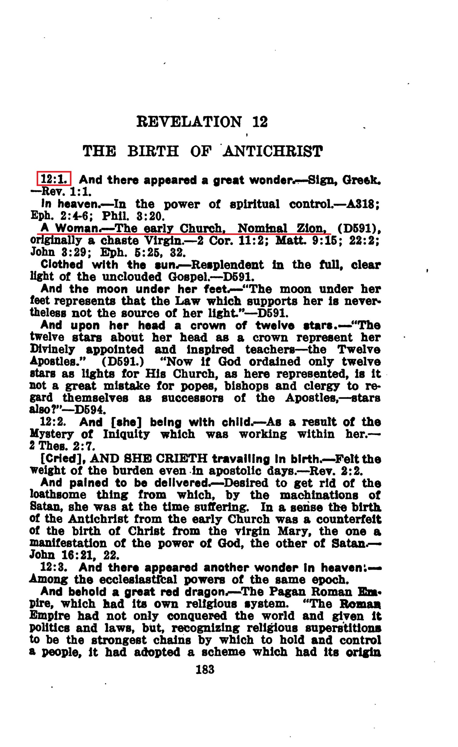 12:1. And there appeared a great wonder. — Sign, Greek, — Rev. 1:1. In heaven. — In the power of spiritual control. — A318; Eph. 2:4-6; Phil. 3:20. A Woman. — The early Church, Nominal Zion, (D591), originally a chaste Virgin. — 2 Cor. 11:2; Matt. 9:15; 22:2; John 3:29; Eph. 5:25, 32. Source : 🇺🇸 1917 - Studies in the Scriptures, Vol 7, The finished mystery, page 183 + Cover |