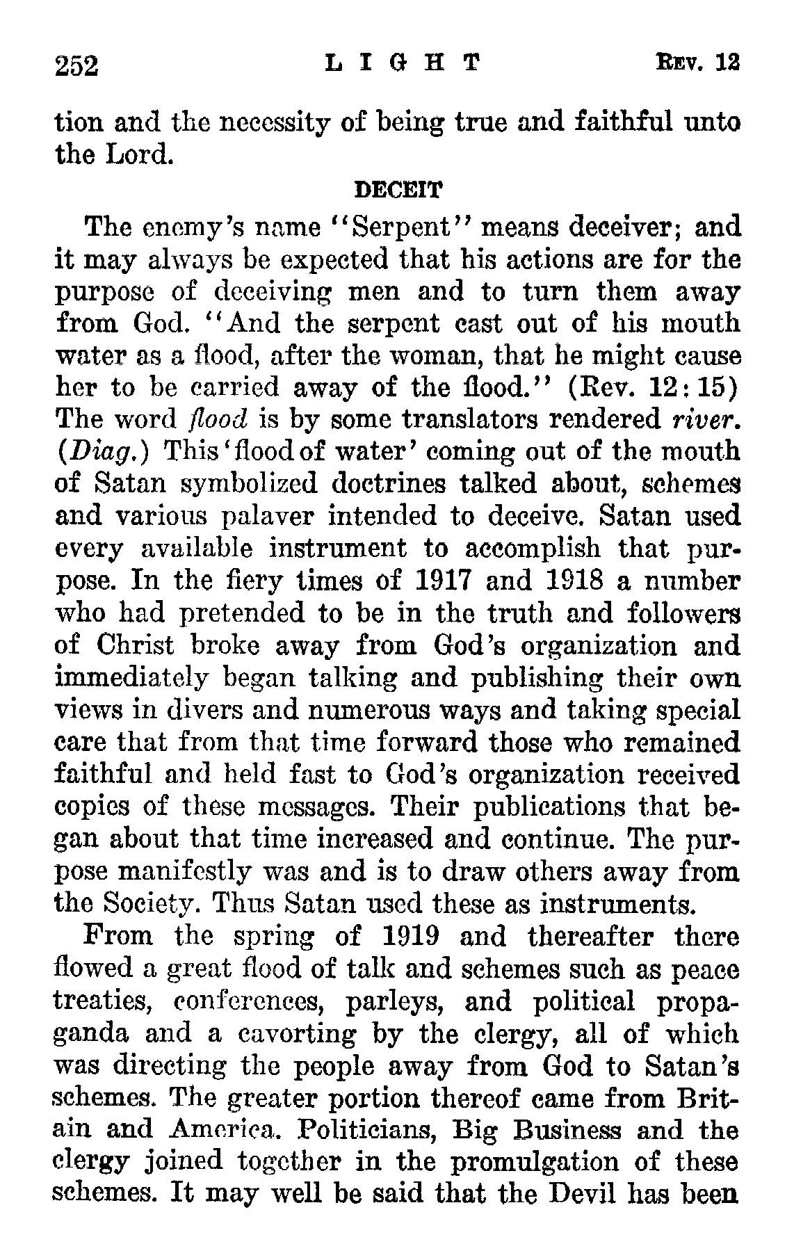 "And the serpent cast out of his mouth water as a flood, after the woman, that he might cause her to be carried away of the flood." (Rev. 12:15) The word flood is by some translators rendered river. (Diag.) This 'flood of water' coming out of the mouth of Satan symbolized doctrines talked about, schemes and various palaver intended to deceive. Satan used every available instrument to accomplish that purpose. In the fiery times of 1917 and 1918 a number who had pretended to be in the truth and followers of Christ broke away from God's organization and immediately began talking and publishing their own views in divers and numerous ways and taking special care that from that time forward those who remained faithful and held fast to God's organization received copies of these messages. Their publications that began about that time increased and continue. The purpose manifestly was and is to draw others away from the Society. Thus Satan used these as instruments. From the spring of 1919 and thereafter there flowed a great flood of talk and schemes such as peace treaties, conferences, parleys, and political propaganda and a cavorting by the clergy, all of which was directing the people away from God to Satan's schemes. The greater portion thereof came from Britain and America. Politicians, Big Business and the clergy joined together in the promulgation of these schemes. It may well be said that the Devil has been using all his "seven mouths", symbolically meaning all his instruments, to thus turn loose a flood of schemes upon the people. Satan's purpose was to sweep the "woman", God's organization, on the earth, along with the current of worldly opinions and talk and to coerce her thereby to worship the beast and his image by taking part in some of these schemes. Source : 🇺🇸 1930 - Light, Vol 2, page 252, page 253 + Cover |