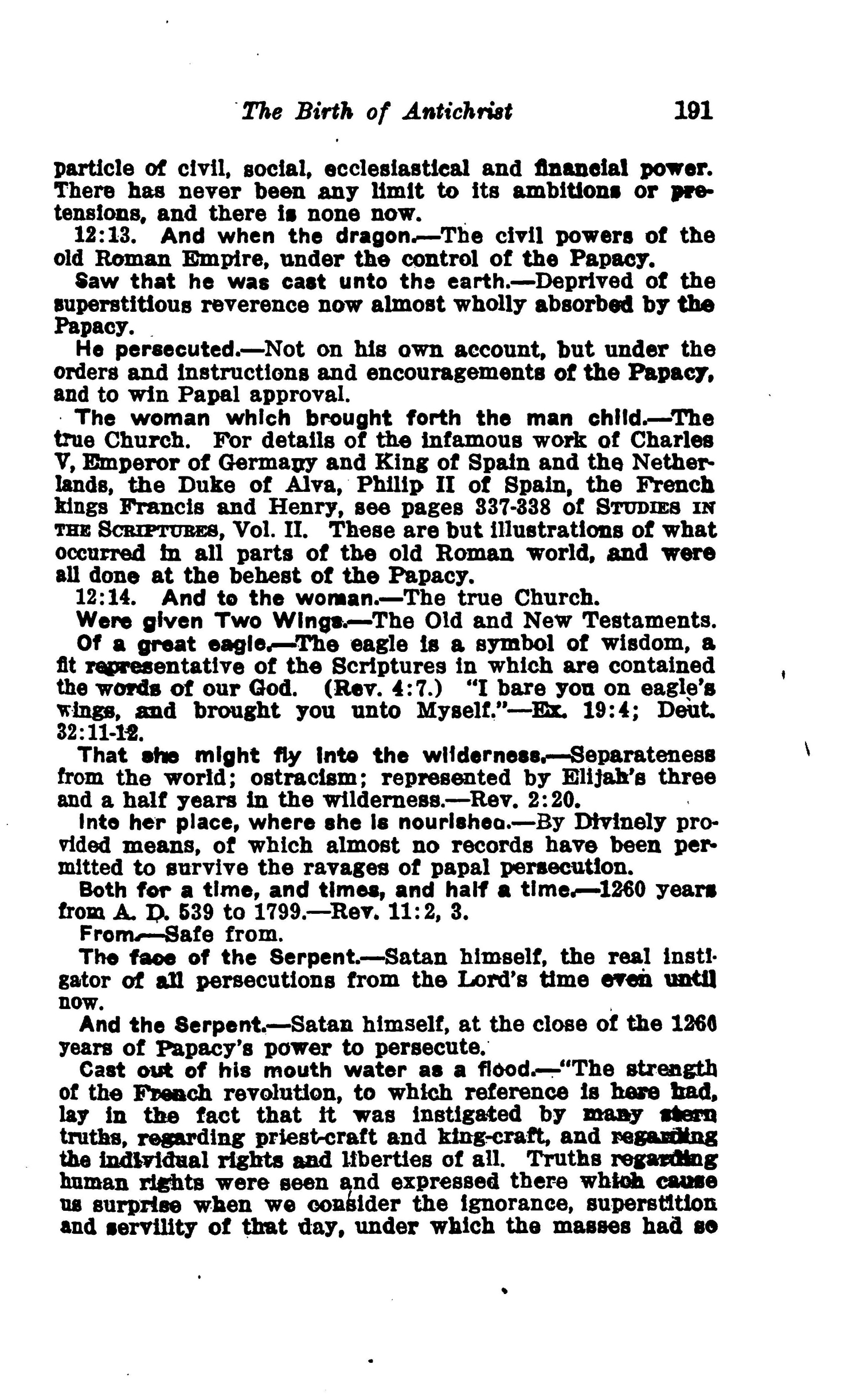 And the Serpent. — Satan himself, at the close of the 1260 years of Papacy's power to persecute. Cast out of his mouth water as a flood. — "The strength of the French revolution, to which reference is here bad, lay in the fact that it was instigated by many stern truths, regarding priest-craft and king-craft, and regarding the individual rights and liberties of all. Truths regarding human rights were seen and expressed there which cause us surprise when we consider the ignorance, superstition and servility of that day, under which the masses had so long rested. Many of the truths which then swept as a flood over France, deluging it with blood, are now very generally accepted among all civilized peoples."— C65. Source : 🇺🇸 1917 - Studies in the Scriptures, Vol 7, The finished mystery, page 191, page 192 + Cover |