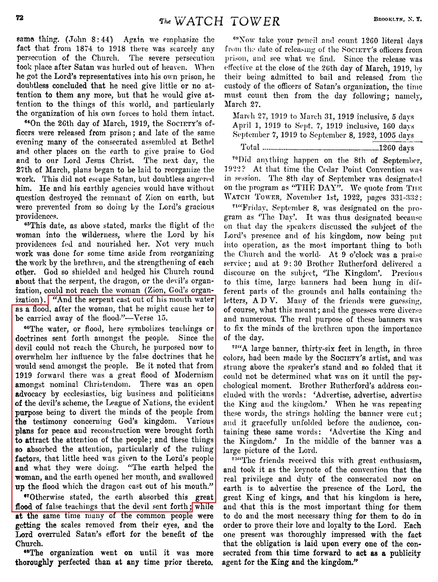 The water, or flood, here symbolizes teachings or doctrines sent forth amongst the people. Since the devil could not reach the Church, he purposed now to overwhelm her influence by the false doctrines that he would send amongst the people. Be it noted that from 1919 forward there was a great flood of Modernism amongst nominal Christendom. There was an open advocacy by ecclesiastics, big business and politicians of the devil’s scheme, the League of Nations, the evident purpose being to divert the minds of the people from the testimony concerning God’s kingdom. Various plans for peace and reconstruction were brought forth to attract the attention of the people; and these things so absorbed the attention, particularly of the ruling factors, that little heed was given to the Lord’s people and what they were doing. "The earth helped the woman, and the earth opened her mouth, and swallowed up the flood which the dragon east out of his mouth." Otherwise stated, the earth absorbed this great flood of false teachings that the devil sent forth; Source : 🇺🇸 The Watchtower, March 1, 1925, page 72 |