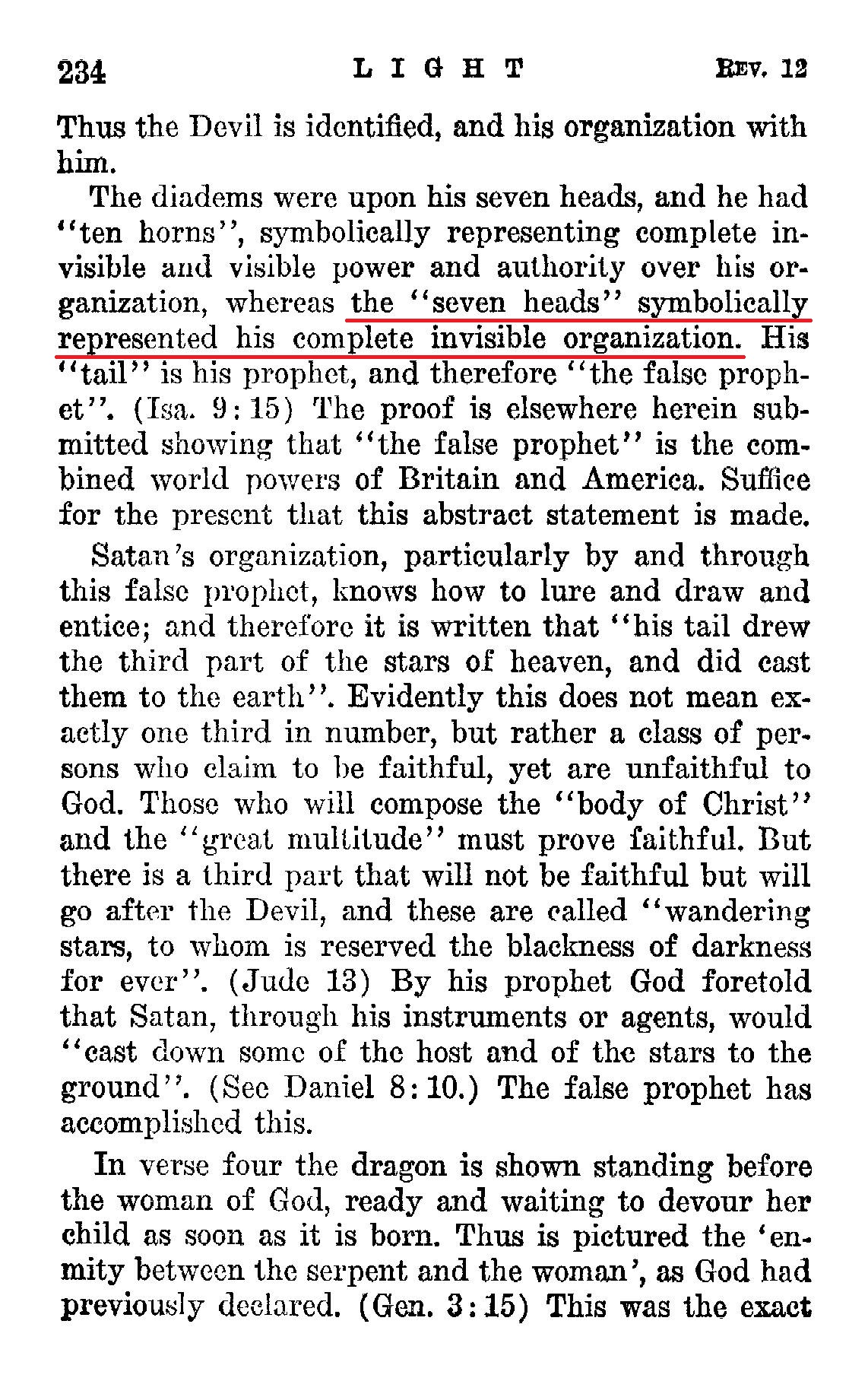 Satan assembled all his host of powers and principalities and angels, symbolized under the "seven heads", and resisted, and war followed. [...] But every head or prince in Satan's invisible organization would be involved. These would induce the visible organization of Satan on earth to war against the members of God's organization on earth, which did take place. Source : 🇺🇸 1930 - Light, Vol 1, page 240, page 241 + Cover |