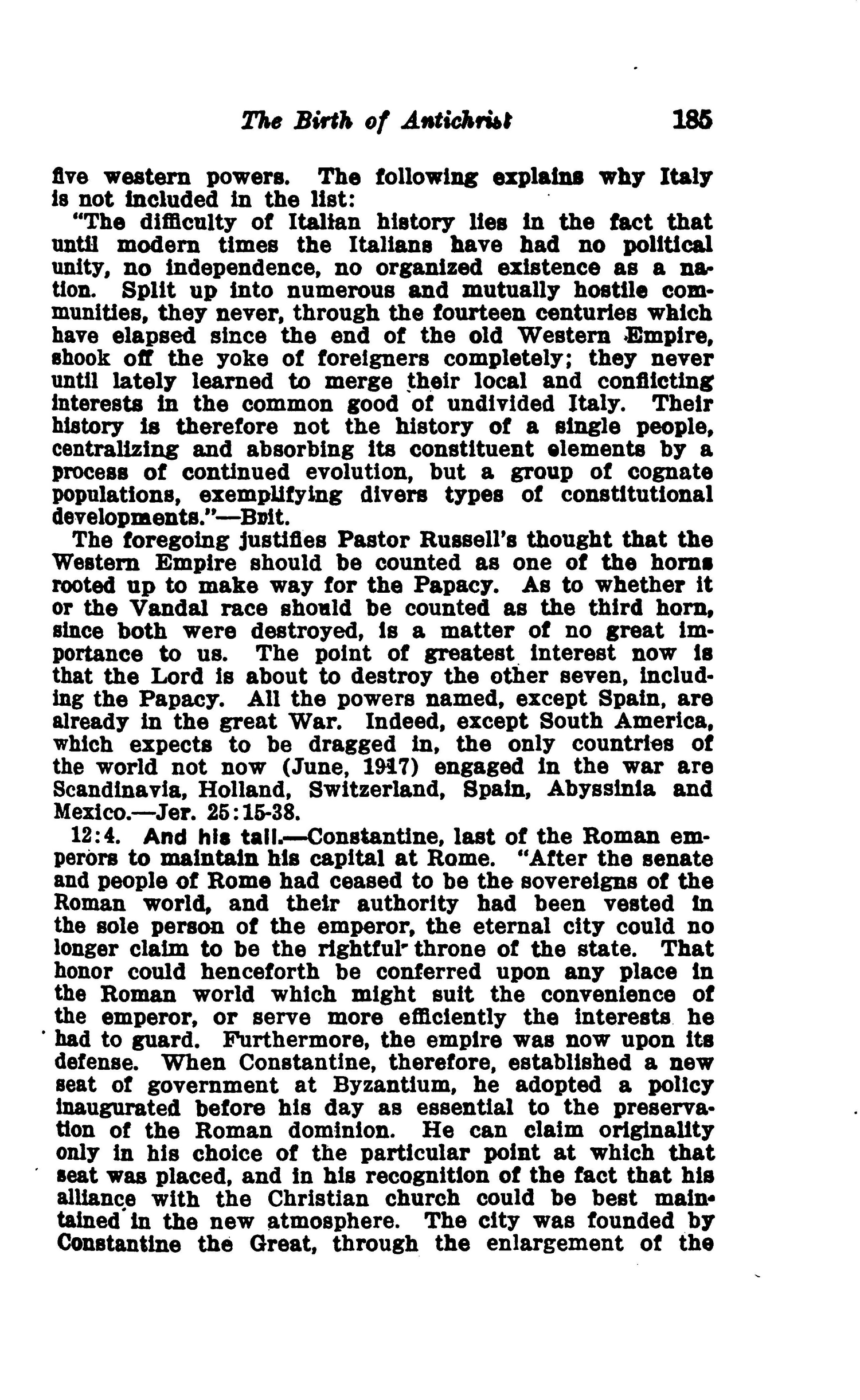 And seven crowns upon his heads. — In the Eastern Empire, corresponding to the present Turkey and the Balkans, and In Lombardy, corresponding to the present Austria, we may see the two horns which remained of the five Eastern powers after the Ostrogoths, Herull and Vandals disappeared. And In the Visigothic Kingdom, corresponding to Spain; Suerla, corresponding to Portugal; the Kingdom of the Franks, corresponding to France and the Netherlands; Saxonia, corresponding to Germany and Scandinavia; and Brittania, corresponding to Great Britain, we may see the five horns which represented the five western powers. The following explains why Italy is not Included in the list: Source : 🇺🇸 1917 - Studies in the Scriptures, Vol 7, The finished mystery, page 184, page 185 + Cover |