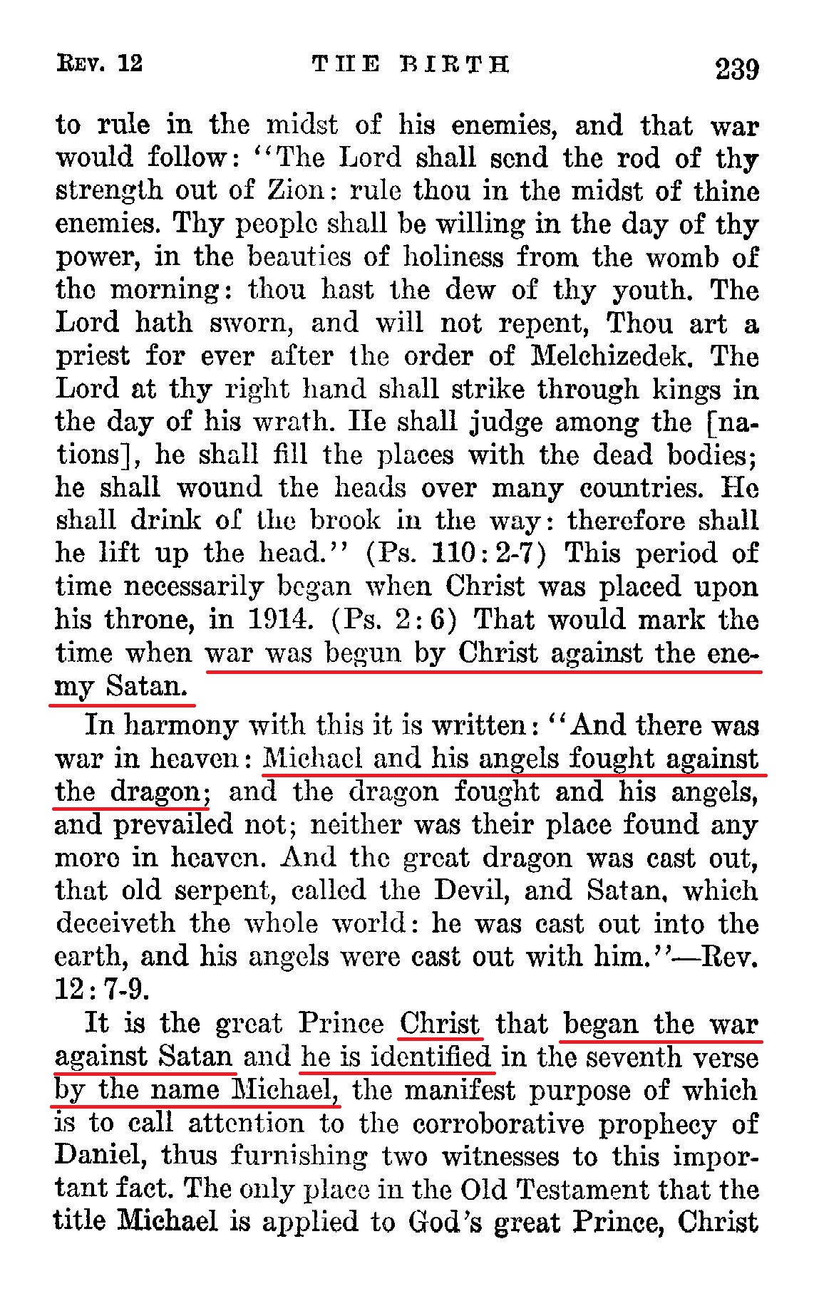 In harmony with this it is written: "And there was war in heaven: Michael and his angels fought against the dragon; and the dragon fought and his angels, and prevailed not; neither was their place found any more in heaven. And the great dragon was cast out, that old serpent, called the Devil, and Satan. which deceiveth the whole world: he was cast out into the earth, and his angels were cast out with him. "-Rev. 12: 7-9. It is the great Prince Christ that began the war against Satan and he is identified in the seventh verse by the name Michael, [...] Source : 🇺🇸 1930 - Light, Vol 2, page 239 + Cover |