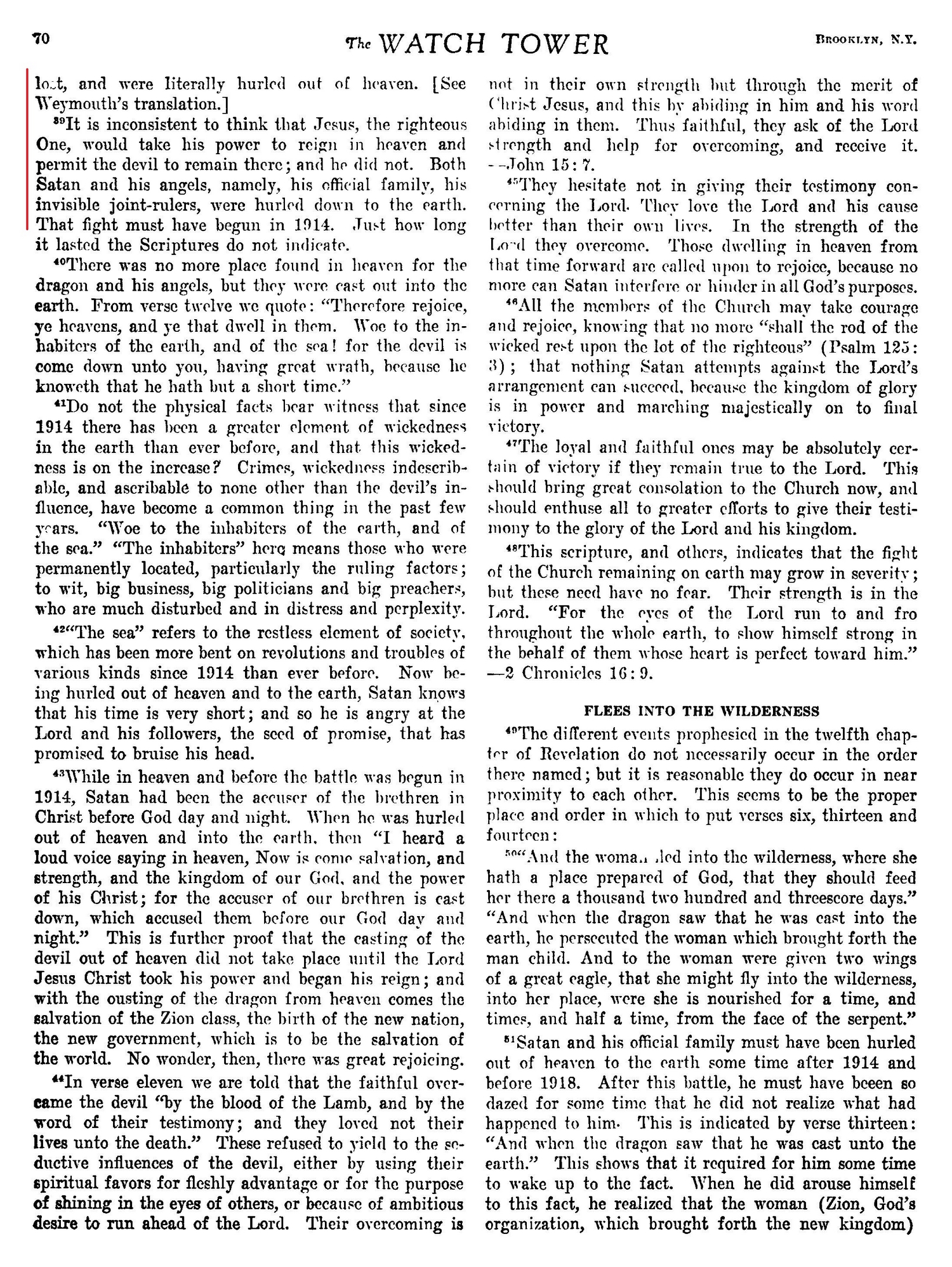 "And there was war in heaven: Michael and his angels fought against the dragon; and the dragon fought and his angels, and prevailed not; neither was their place found any more in heaven. And the great dragon was cast out, that old serpent, called the Devil, and Satan, which deceiveth the whole world: he was cast out into the earth, and his angels were cast out; with him." This is no imaginary thing; it was a real fight. The dragon and his official family, members of his invisible government, fought and fought hard; but they lost, and were literally hurled out of heaven. [See Weymonth’s translation.] It is inconsistent to think that Jesus, tile righteous One, would take his power to reign in heaven and permit the devil to remain there; and he did not. Both Satan and his angels, namely, his ocfficial family, his invisible joint-rulers, were hurled down to the earth. That fight must have begun in 1914. Source : 🇺🇸 The Watchtower, March 1 1925, page 69, page 70 |