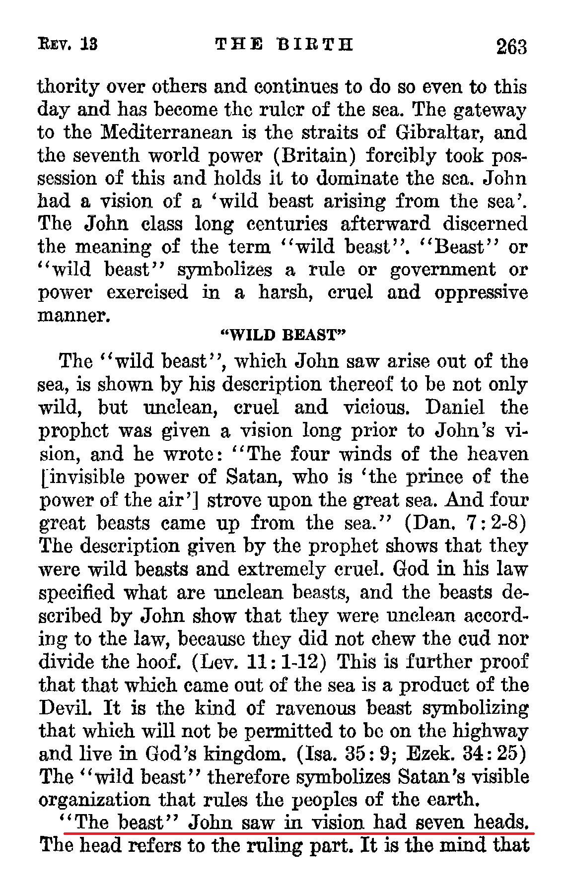 "The beast" John saw in vision had seven heads. [...] The head is the one that directs the course of action taken by the body. "Seven" is a symbolic number representing completeness. Satan is the head of his organization, and the symbol "seven" therefore stands for the entire organization, and particularly refers to the invisible parts of Satan's organization.