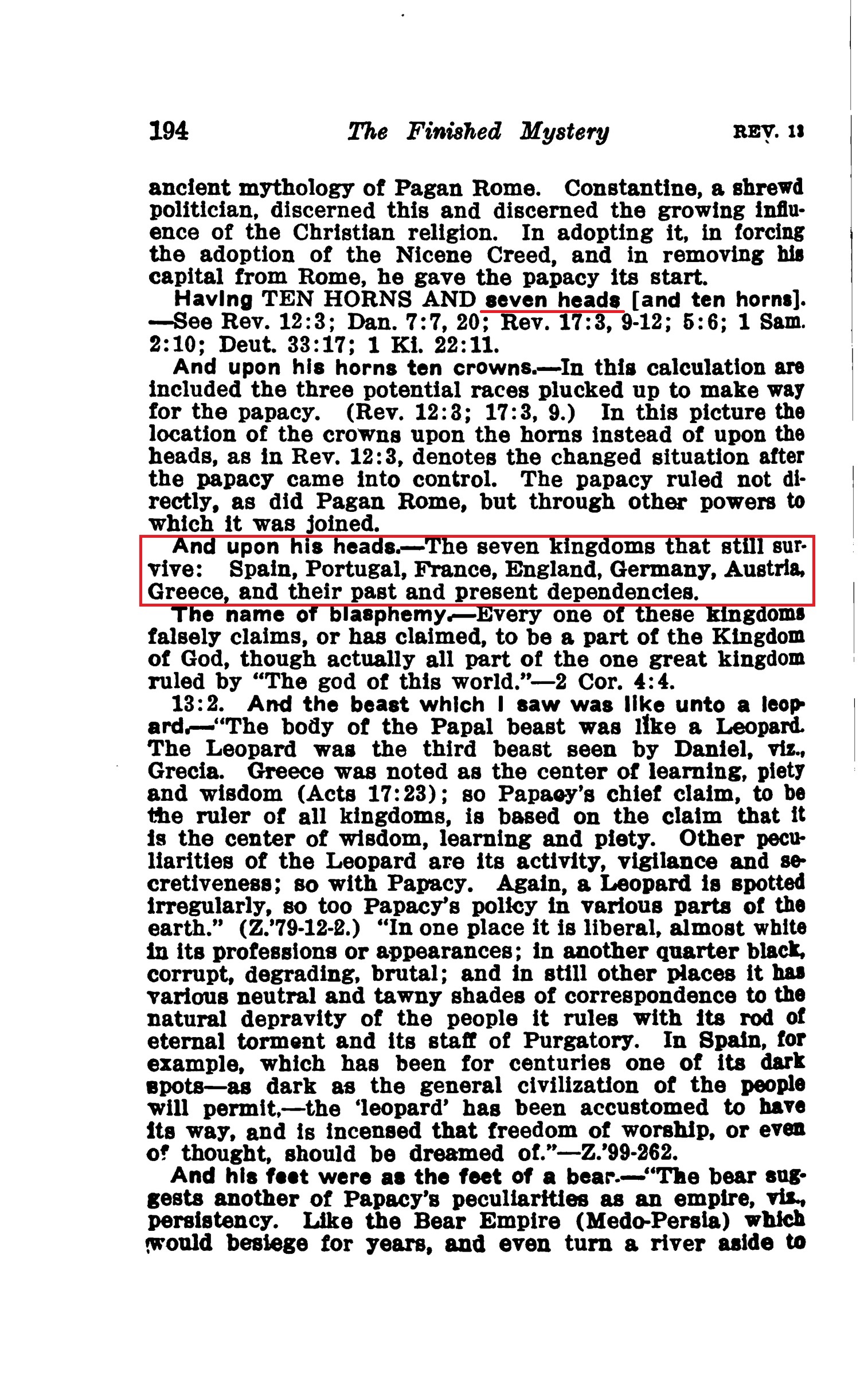 Having TEN HORNS AND seven heads [and ten horns]. - [...] And upon his heads. — The seven kingdoms that still survive: Spain, Portugal, France, England, Germany, Austria, Greece, and their past and present dependencies. Source : 🇺🇸 1917 - Studies in the Scriptures, Vol 7, The finished mystery, page 194 + Cover |