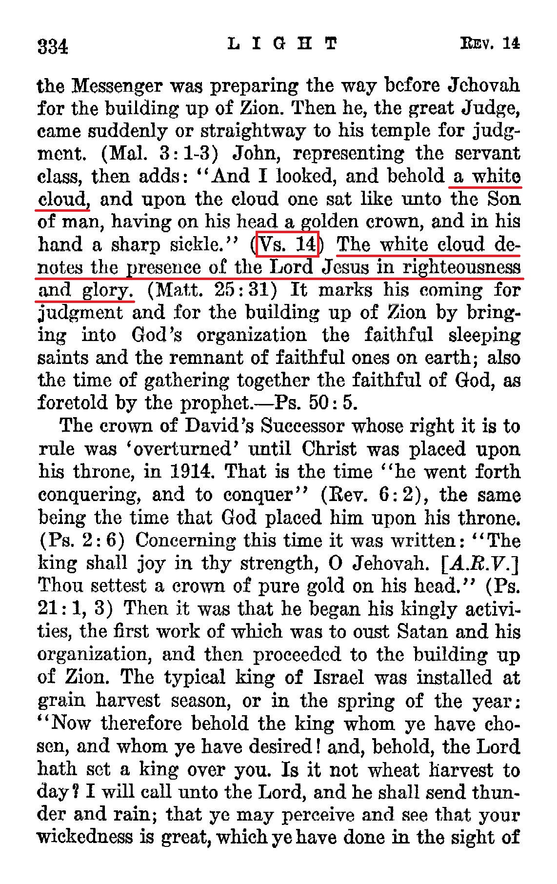 14:14. [And I looked], and behold a white cloud. — See Rev. 10:1. As the cloud indicates the Time of Trouble, so the white indicates the pure motive back of it. Source : 🇺🇸 1917 - Studies in the Scriptures, Vol 7, The finished mystery, page 225 + Cover |