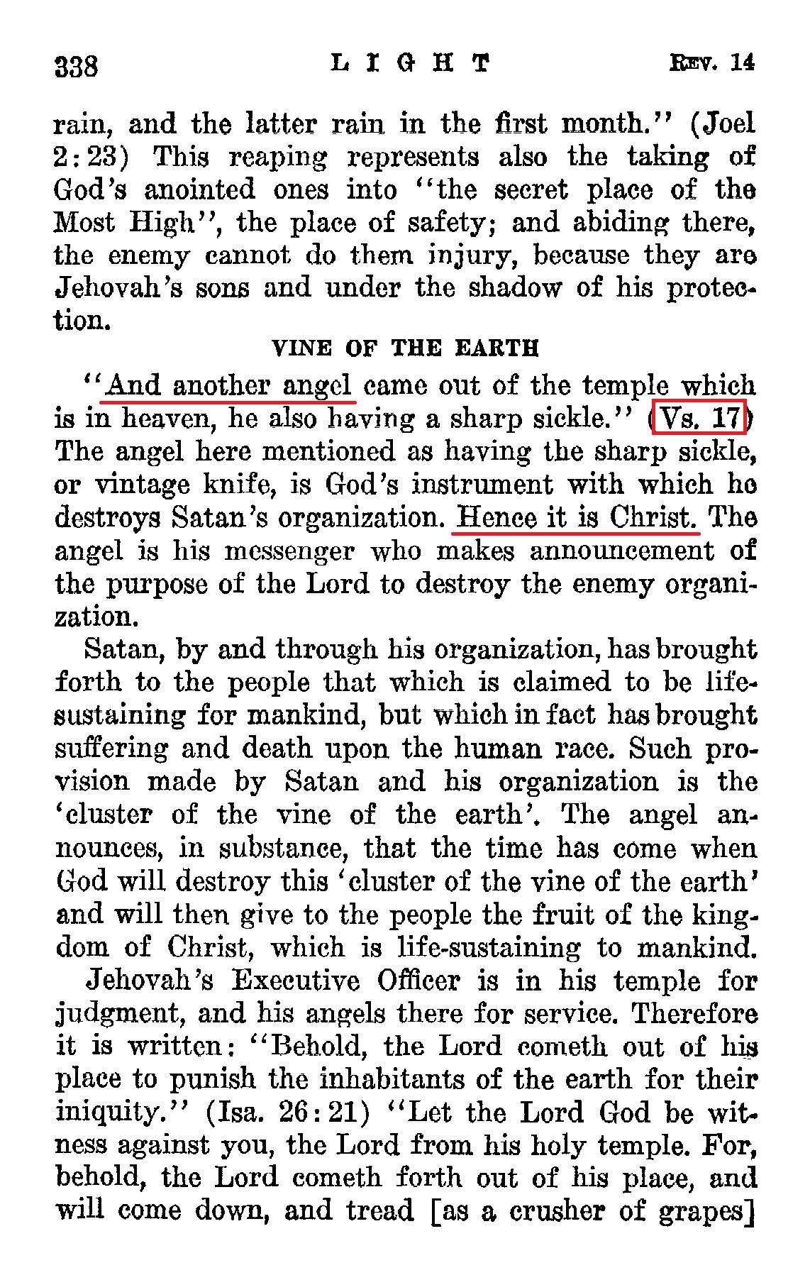 "And another angel came out of the temple which is in heaven, he also having a sharp sickle." (Vs, 17) The angel here mentioned as having the sharp sickle, or vintage knife, is God's instrument with which he destroys Satan's organization. Hence it is Christ. The angel is his messenger who makes announcement of the purpose of the Lord to destroy the enemy organization.