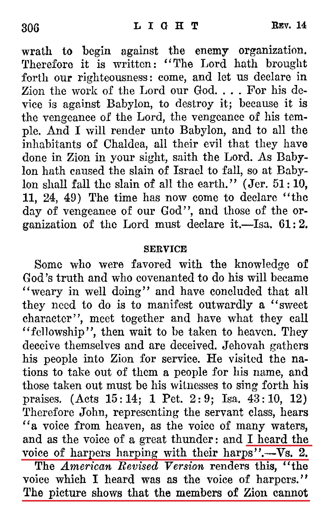 Therefore John, representing the servant class, hears "a voice from heaven, as the voice of many waters, and as the voice of a great thunder: and I heard the voice of harpers harping with their harps".- Vs. 2. The American Revised Version renders this, "the voice which I heard was as the voice of harpers." The picture shows that the members of Zion cannot and do not keep still. They cannot, because "in his temple doth everyone speak of his glory". (Ps. 29:9) Being in the temple, they must sing forth Jehovah's praise. Where there are those who claim to be followers of Christ and who are using the soft pedal concerning Satan's organization, or who insist on keeping still and ignoring the fact that Satan has an organization, such is conclusive proof that they are not of Zion, whatever else might be their position. Let no one who has entered into a covenant with the