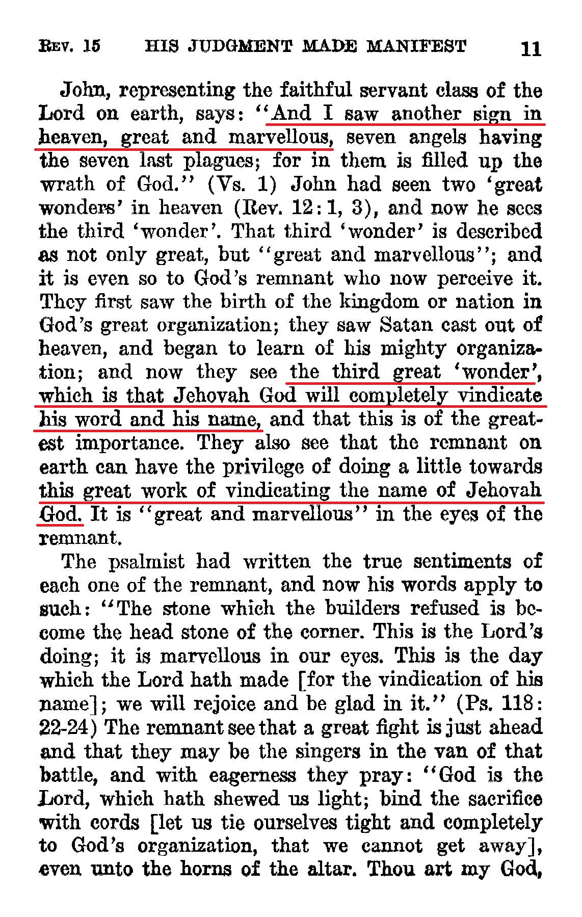 John, representing the faithful servant class of the Lord on earth, says: "And I saw another sign in heaven, great and marvellous, seven angels having the seven last plagues; for in them is filled up the wrath of God." (Vs, 1) John had seen two 'great wonders' in heaven (Rev. 12:1,3) and now he sees the third 'wonder'. That third 'wonder' is described as not only great, but "great and marvellous"; and it is even so to God's remnant who now perceive it. They first saw the birth of the kingdom or nation in God's great organization; they saw Satan cast out of heaven, and began to learn of his mighty organization; and now they see the third great 'wonder', which is that Jehovah God will completely vindicate his word and his name, and that this is of the greatest importance. They also see that the remnant on earth can have the privilege of doing a little towards this great work of vindicating the name of Jehovah God. It is "great and marvellous" in the eyes of the remnant.
