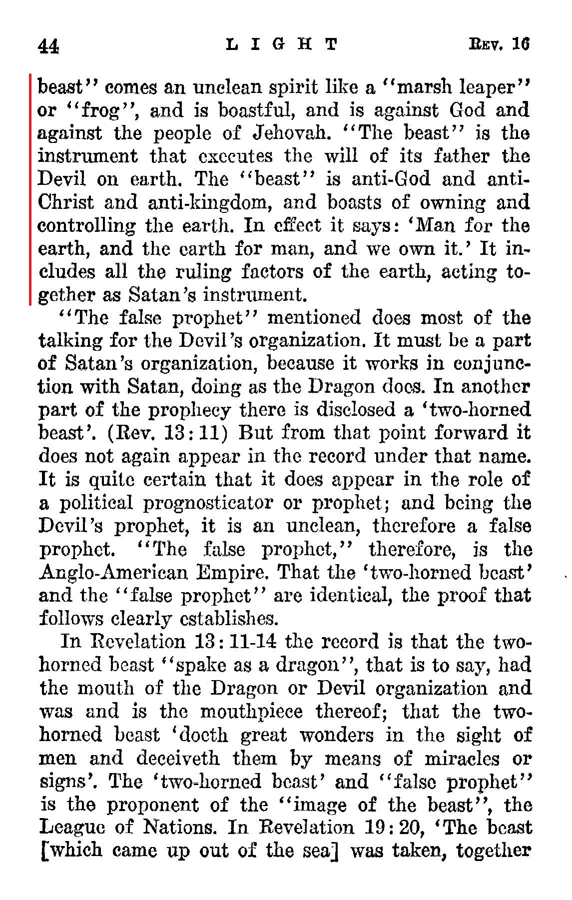 "The beast" is the organization of Satan as seen upon the earth. "The beast" received its authority from Satan: 'And there was given to him [the beast] a mouth speaking great and blasphemous things against God and against his organization.' (Rev. 13: 5, 6; Dan. 7:7, 8, 20) Out of the mouth of "the beast" comes an unclean spirit like a "marsh leaper" or "frog ", and is boastful, and is against God and against the people of Jehovah. "The beast" is the instrument that executes the will of its father the Devil on earth. The "beast" is anti-God and antiChrist and anti-kingdom, and boasts of owning and controlling the earth. In effect it says: 'Man for the earth, and the earth for man, and we own it.' It includes all the ruling factors of the earth, acting together as Satan's instrument. Source : 🇺🇸 1930 - Light, Vol 2, page 43, page 44 + Cover |