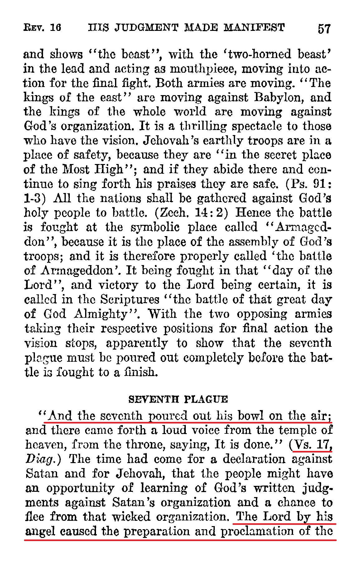 "And the seventh poured out his bowl on the air; and there came forth a loud voice from the temple of heaven, from the throne, saying, It is done." (Vs. 17, Diag.) The time had come for a declaration against Satan and for Jehovah, that the people might have an opportunity of learning of God's written judgments against Satan's organization and a chance to flee from that wicked organization. The Lord by his angel caused the preparation and proclamation of the message, and gives his people on earth a small part therein. The earthly stage was set for the people of God to have a part in this work. The greatest network of radio stations ever on earth up to that time was provided and in which one hundred and seven radio stations were tied together and simultaneously broadcast the message, and showing some part that God's people had to do with the 'pouring out of this bowl'. It was at Detroit, Sunday morning, August 5, 1928, before a visible audience of many thousands and an invisible audience of far greater size that the "Declaration against Satan and for Jehovah" was brought forth and adopted, and which marked the beginning of the 'pouring out of the seventh bowl' so far as God's people on earth are related thereto. [...] and now the "Declaration" must be made directly against Satan himself. It was the Lord's doing, and not man's. It was the manifestation of Jehovah's judgment. The pouring out of the contents of the seventh bowl, which began at Detroit on that occasion, continues, and must continue until the great battle is fought; Source : 🇺🇸 1930 - Light, Vol 2, page 57, page 58, page 59 + Cover |