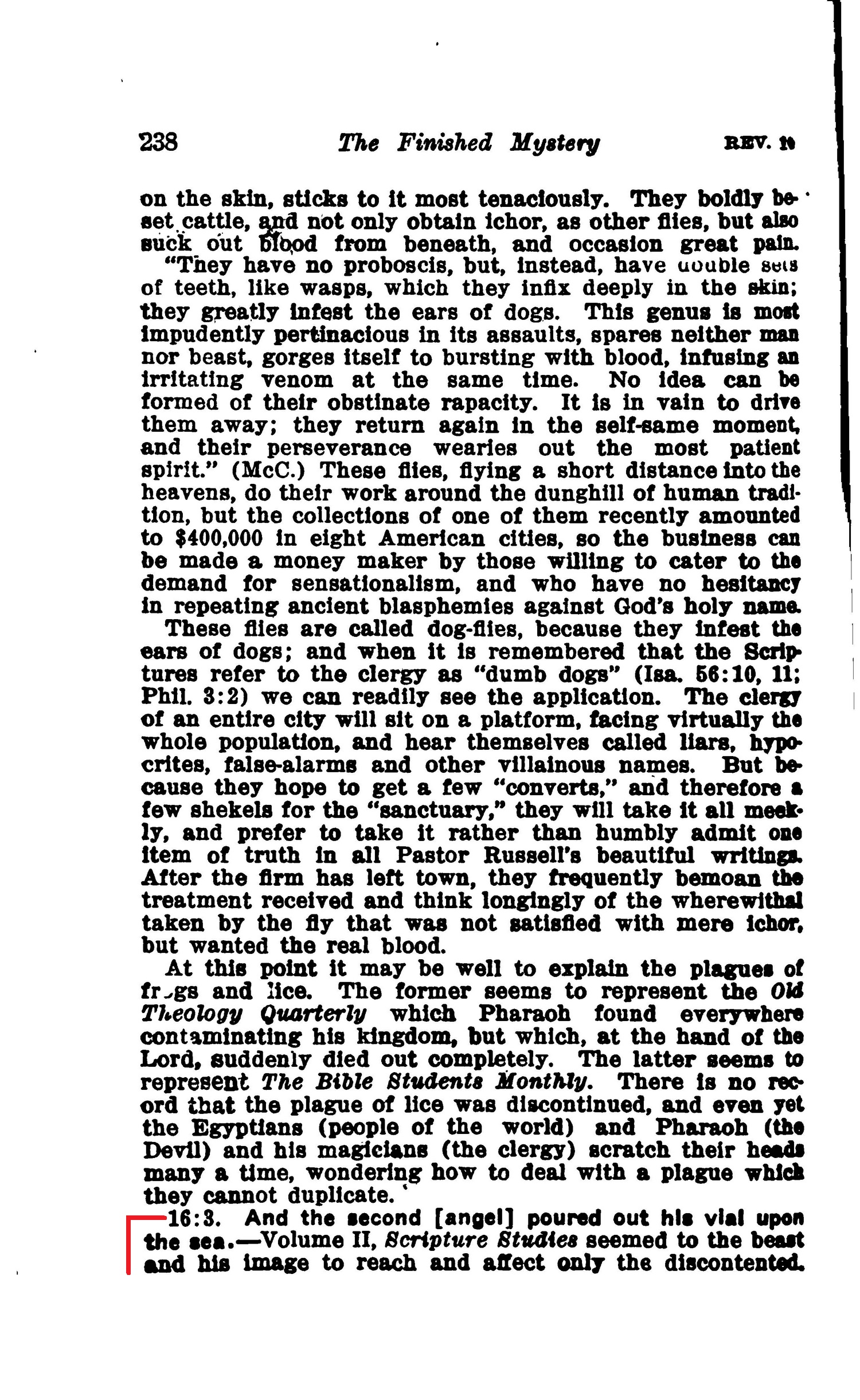 16:3. And the second [angel] poured out his vial upon the sea. — Volume II, Scripture Studies seemed to the beast and his image to reach and affect only the discontented. Source : 🇺🇸 1917 - Studies in the Scriptures, Vol 7, The finished mystery, page 238 + Cover |