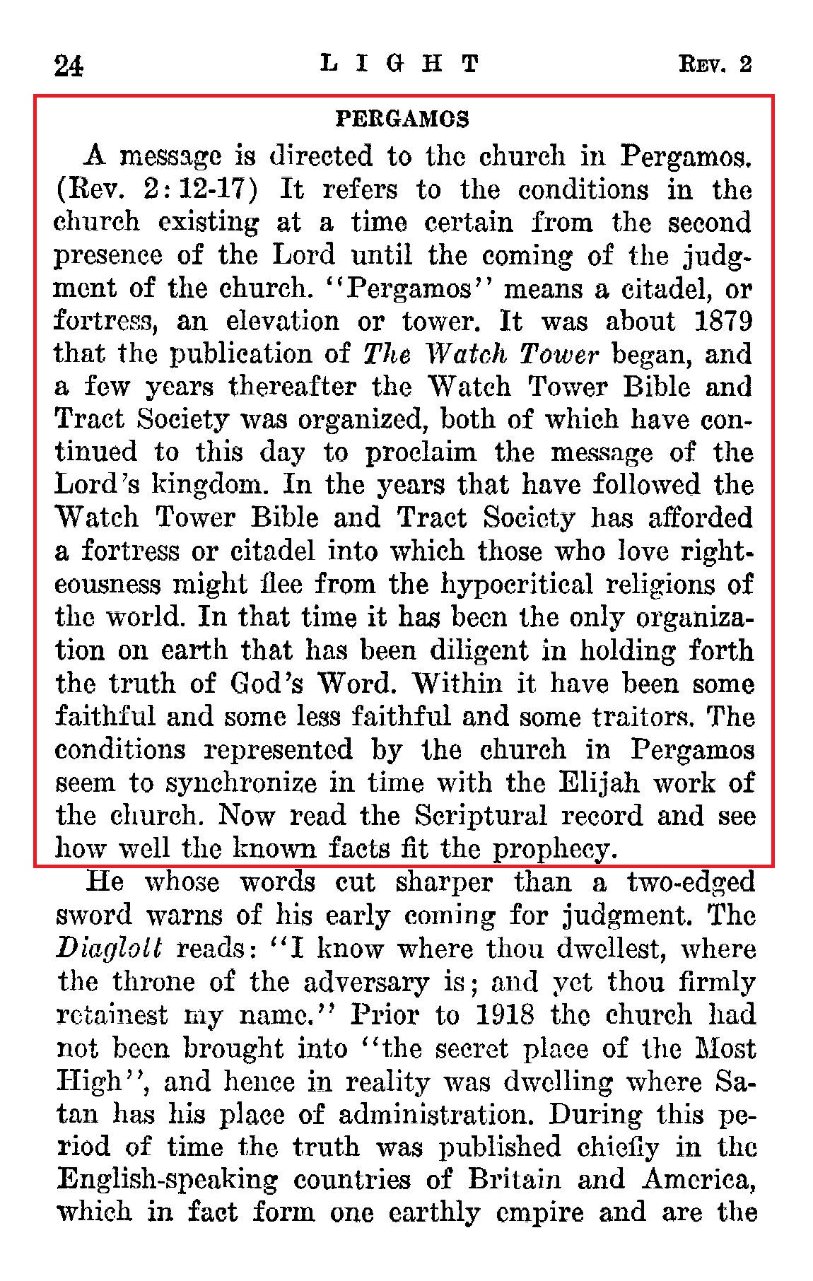 A message is directed to the church in Pergamos, (Rev. 2: 12-17) It refers to the conditions in the church existing at a time certain from the second presence of the Lord until the coming of the judgment of the church. "Pergamos" means a citadel, or fortress, an elevation or tower. It was about 1879 that the publication of The Watch Tower began, and a few years thereafter the Watch Tower Bible and Tract Society was organized, both of which have continued to this day to proclaim the message of the Lord's kingdom. In the years that have followed the Watch Tower Bible and Tract Society has afforded a fortress or citadel into which those who love righteousness might flee from the hypocritical religions of the world. In that time it has been the only organization on earth that has been diligent in holding forth the truth of God's Word. Within it have been some faithful and some less faithful and some traitors, The conditions represented by the church in Pergamos seem to synchronize in time with the Elijah work of the church. Now read the Scriptural record and see how well the known facts fit the prophecy. Source : 🇺🇸 1930 - Light, vol 1, page 24 + Cover |