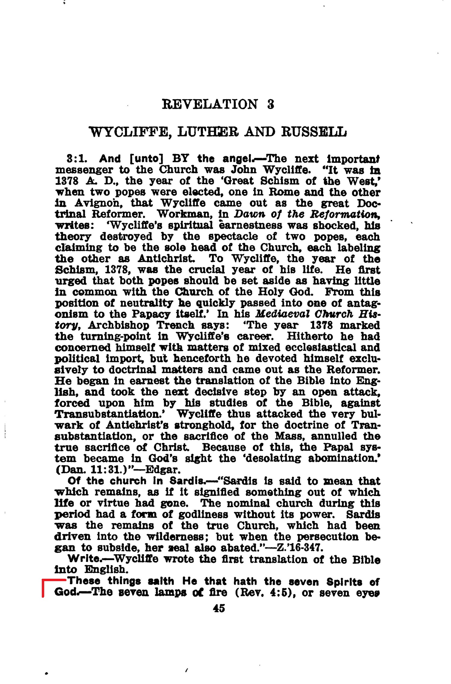 Chapters two and three of Revelation deal with the churches. Unto "John to the seven churches which are in Asia" the message is sent "from him which is, and which was, and which is to come [that is, the Eternal Jehovah God]; and from the seven spirits [picturing completeness, the holy spirit of Jehovah] which are before his throne; and from Jesus Christ, who is the faithful witness" whose blood cleanses us from our sins. Source : 🇺🇸 1930 - Light, vol 1, page 14 + Cover |