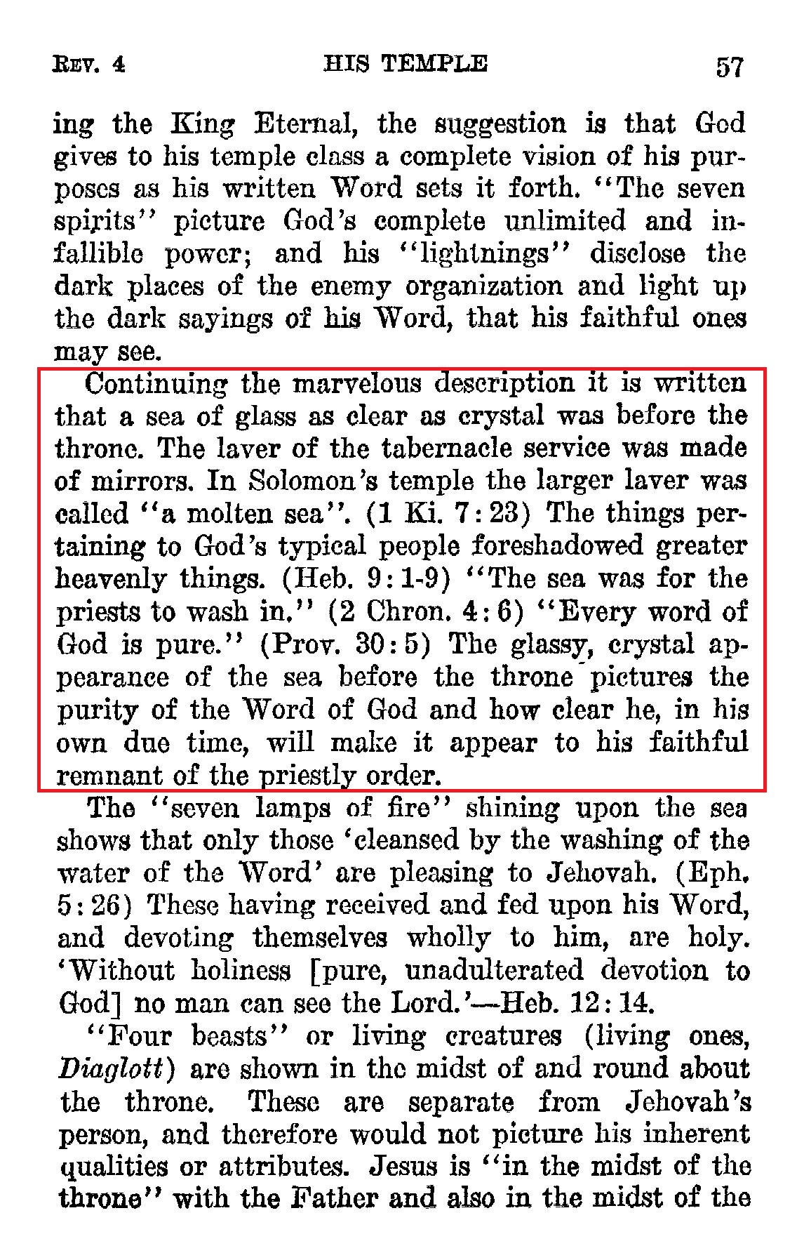 Continuing the marvelous description it is written that a sea of glass as clear as crystal was before the throne. The laver of the tabernacle service was made of mirrors. In Solomon's temple the larger laver was called "a molten sea". (1 Ki. 7: 23) The things pertaining to God's typical people foreshadowed greater heavenly things. (Heb, 9: 1.9) "The sea was for the priests to wash in." (2 Chron, 4:6) "Every word of God is pure." (Prov, 30: 5) The glassy, crystal appearance of the sea before the throne -pictures the purity of the Word of God and how clear he, in his own due time, will make it appear to his faithful remnant of the priestly order. Source : 🇺🇸 1930 - Light, vol 1, page 57 + Cover |