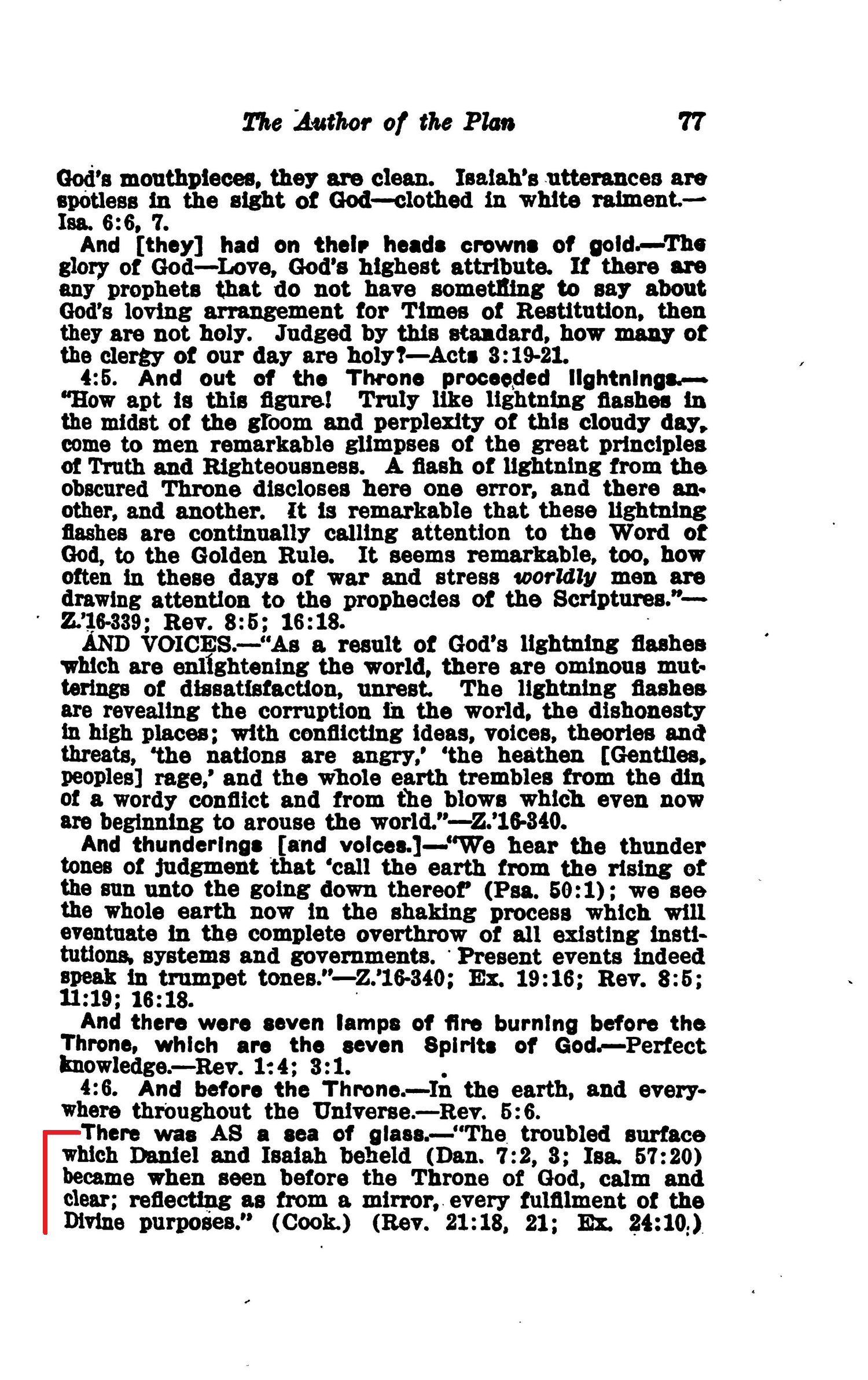 There was AS a sea of glass. —"The troubled surface which Daniel and Isaiah beheld (Dan. 7:2, 3; Isa. 57:20) became when seen before the Throne of God, calm and clear; reflecting as from a mirror, every fulfilment of the Divine purposes." (Cook.) (Rev. 21:18, 21; Ex. 24:10;) The sea (godless conditions about them) has been a means of purifying earth's future priests.—1 Ki. 7:23-26, 38, 39. Like unto crystal. — Indicating that nothing escapes God's notice; all is transparent. Source : 🇺🇸 1917- Studies in the Scriptures, Vol 7, The finished mystery, page 77, page 78 + Cover |