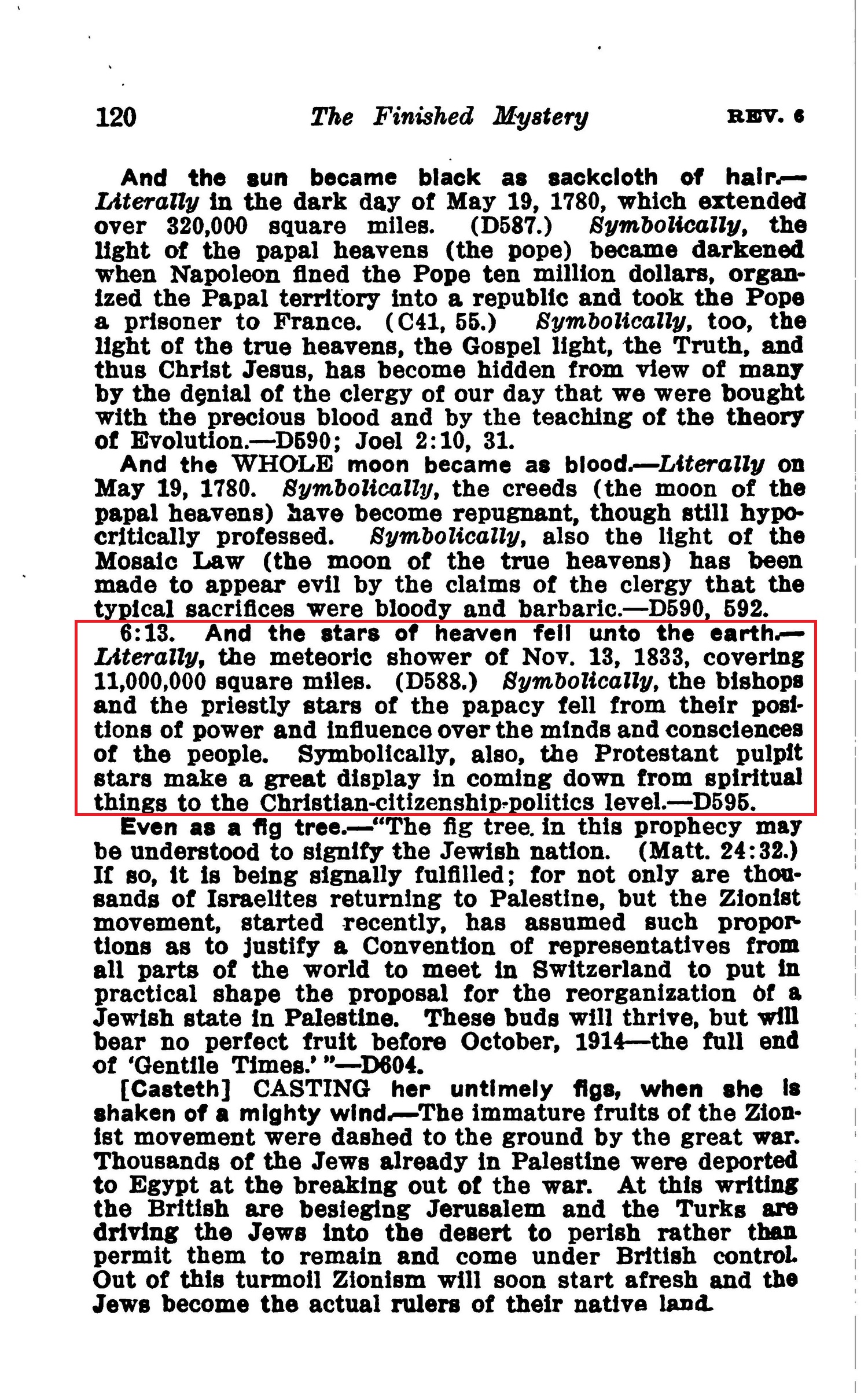 6:13. And the stars of heaven fell unto the earth.— Literally, the meteoric shower of Nov. 13, 1833, covering 11,000,000 square miles. (D588.) Symbolically, the bishops and the priestly stars of the papacy fell from their positions of power and Influence over the minds and consciences of the people. Symbolically, also, the Protestant pulpit stars make a great display In coming down from spiritual things to the Christian-citlizenship-politlcs level.—D596.