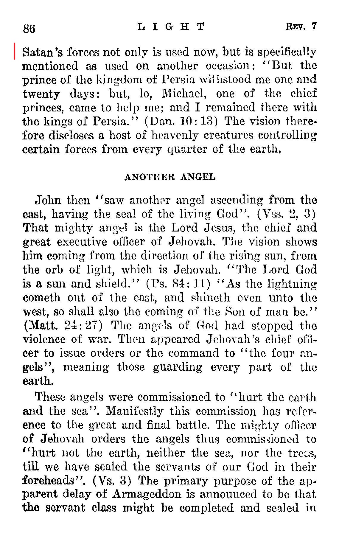 "Four angels standing on the Iour corners of the earth" means all the angels required to restrain the operations of the enemy in any and every part of the earth. Those angels are not human creatures or human agencies, but are "the holy angels" of God invisible to man and who accompany and act as the deputies of Christ Jesus when he comes for judgment. (Matt. 25: 31) The heavenly power to restrain Satan's forces [...] Source : 🇺🇸 1930 - Light, vol 1, page 85, page 86 + Cover |