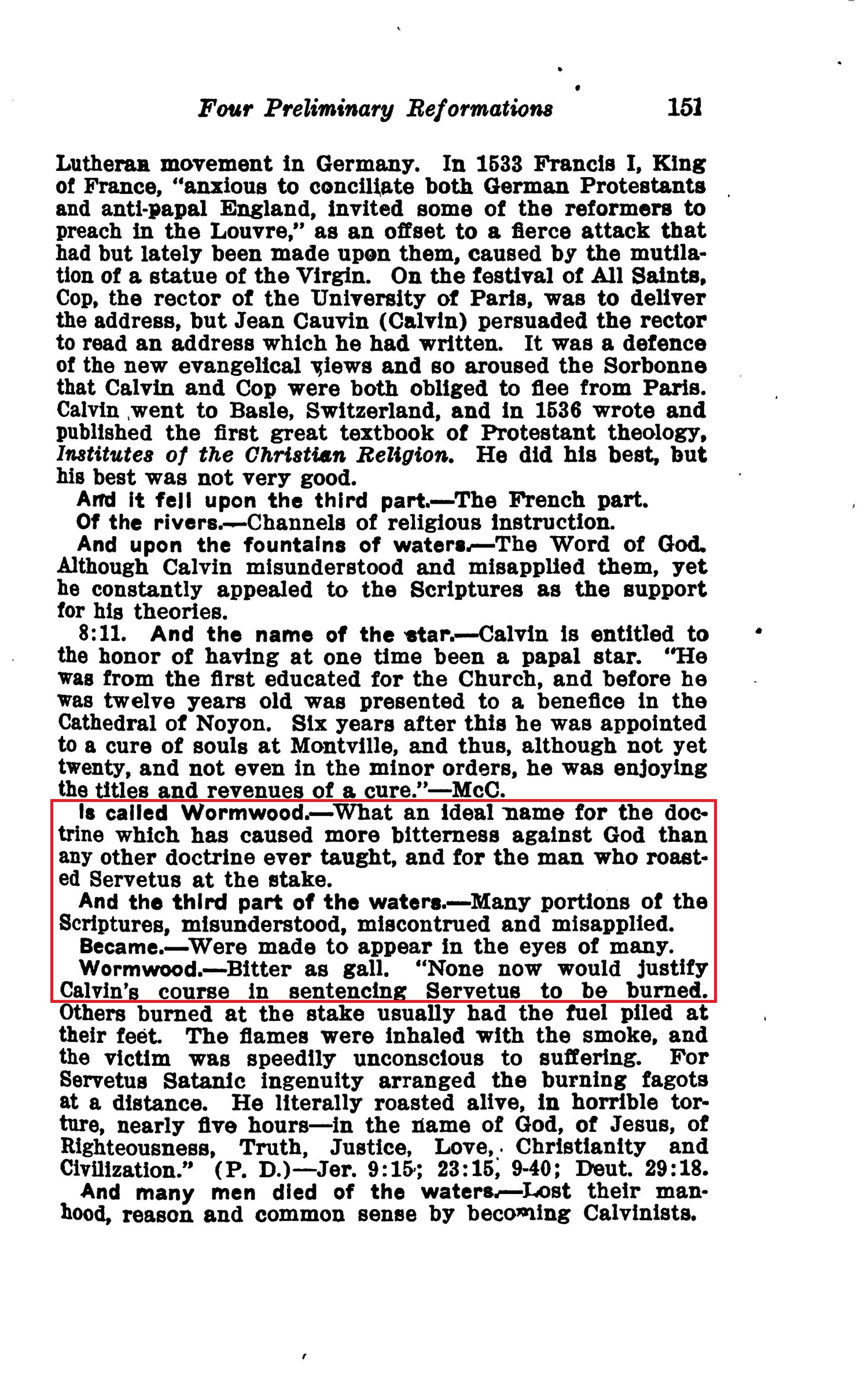 Is called Wormwood. - What an ideal name for the doctrine which has caused more bitterness against God than any other doctrine ever taught, and for the man who roasted Servetus at the stake. And the third part of the waters. — Many portions of the Scriptures, misunderstood, miscontrued and misapplied. Became. — Were made to appear In the eyes of many. Wormwood. — Bitter as gall. "None now would justify Calvin's course in sentencing Servetus to be burned. Source : 🇺🇸 1917 - Studies in the Scriptures, Vol 7, The finished mystery, page 151 + Cover |