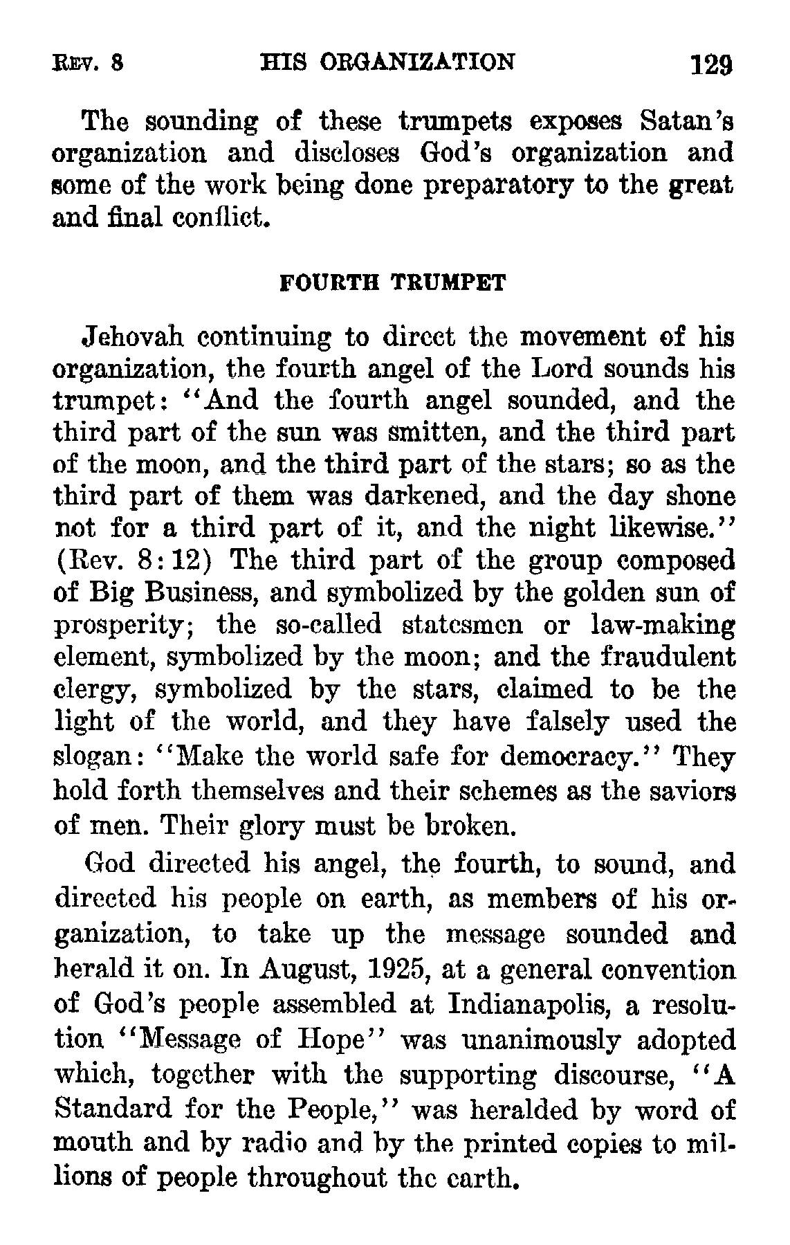 Jehovah continuing to direct the movement of his organization, the fourth angel of the Lord sounds his trumpet: [...] God directed his angel, the fourth, to sound, and directed his people on earth, as members of his organization, to take up the message sounded and herald it on. In August, 1925, at a general convention of God's people assembled at Indianapolis, a resolution "Message of Hope" was unanimously adopted which, together with the supporting discourse, "A Standard for the People," was heralded by word of mouth and by radio and by the printed copies to millions of people throughout the earth. Source : 🇺🇸 1930 - Light, vol 1, page 129 + Cover |