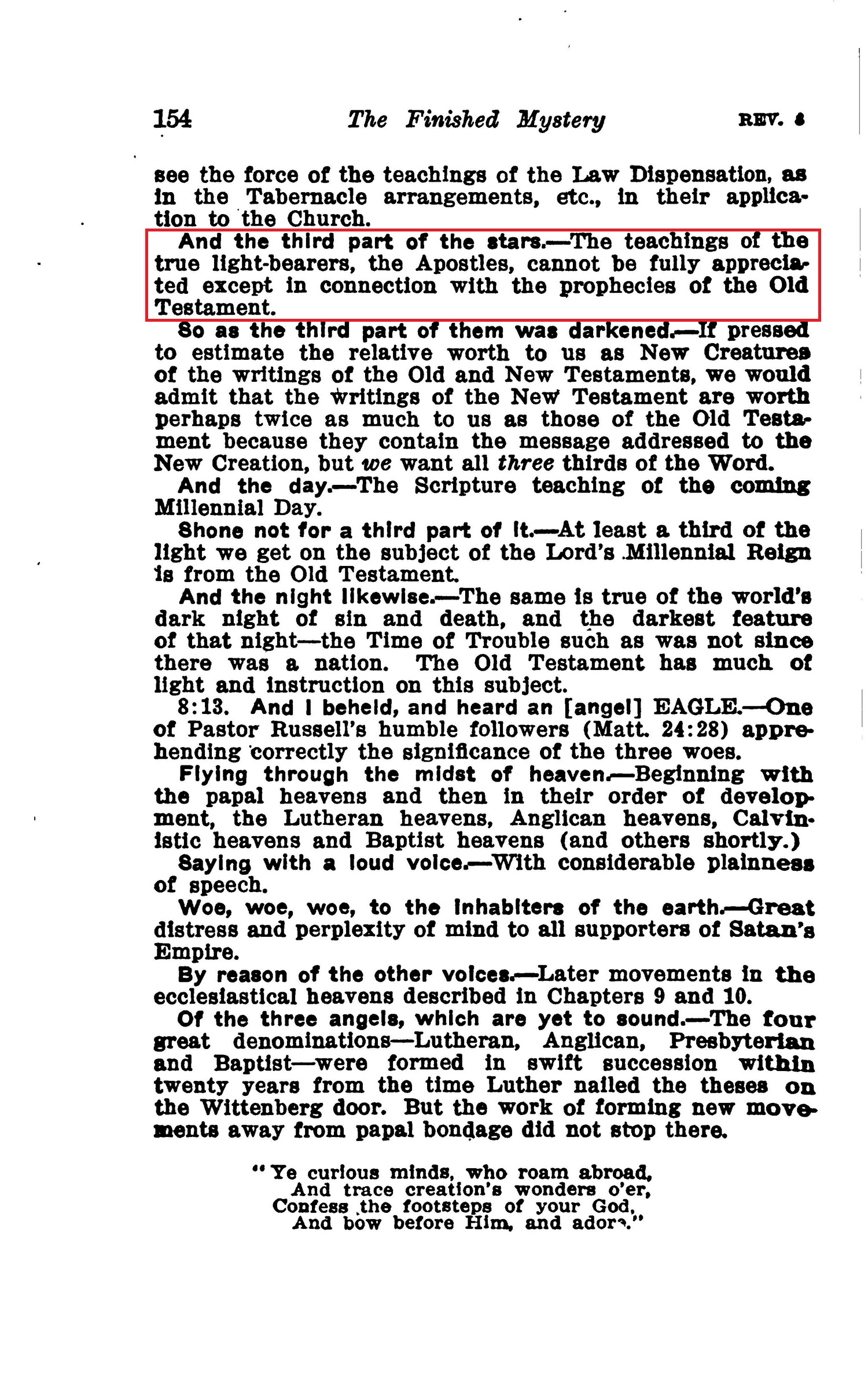 And the third part of the stars. — The teachings of the true light-bearers, the Apostles, cannot be fully appreciated except in connection with the prophecies of the Old Testament. Source : 🇺🇸 1917 - Studies in the Scriptures, Vol 7, The finished mystery, page 154 + Cover |