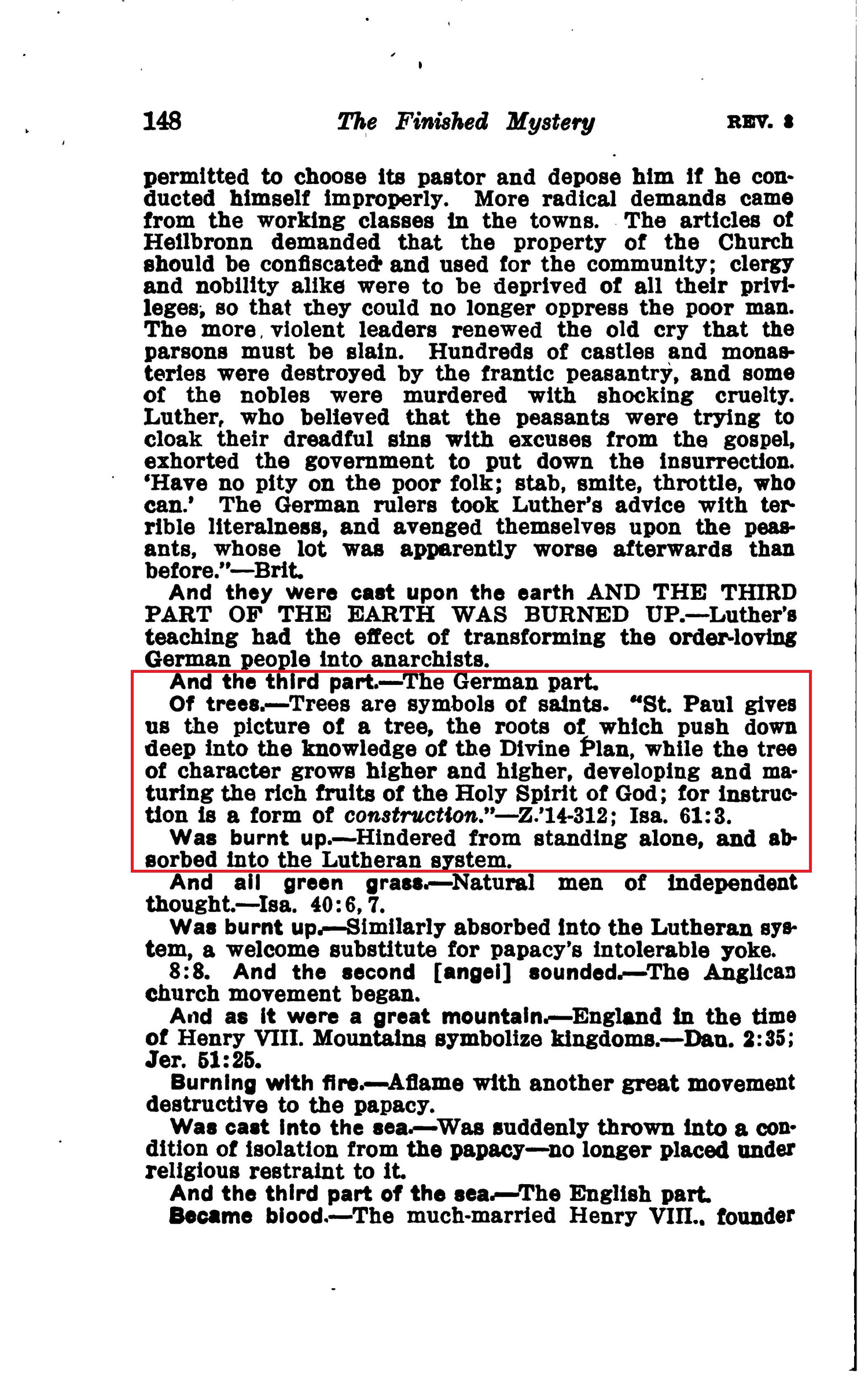 Of trees.—Trees are symbols of saints. "St Paul gives us the picture of a tree, the roots of which push down deep Into the knowledge of the Divine Plan, while the tree of character grows higher and higher, developing and maturing the rich fruits of the Holy Spirit of God; for instruction is a form of construction."—Z.'14-312; Isa. 61:3. Was burnt up.—Hindered from standing alone, and absorbed into the Lutheran system. Source : 🇺🇸 1917 - Studies in the Scriptures, Vol 7, The finished mystery, page 148 + Cover |