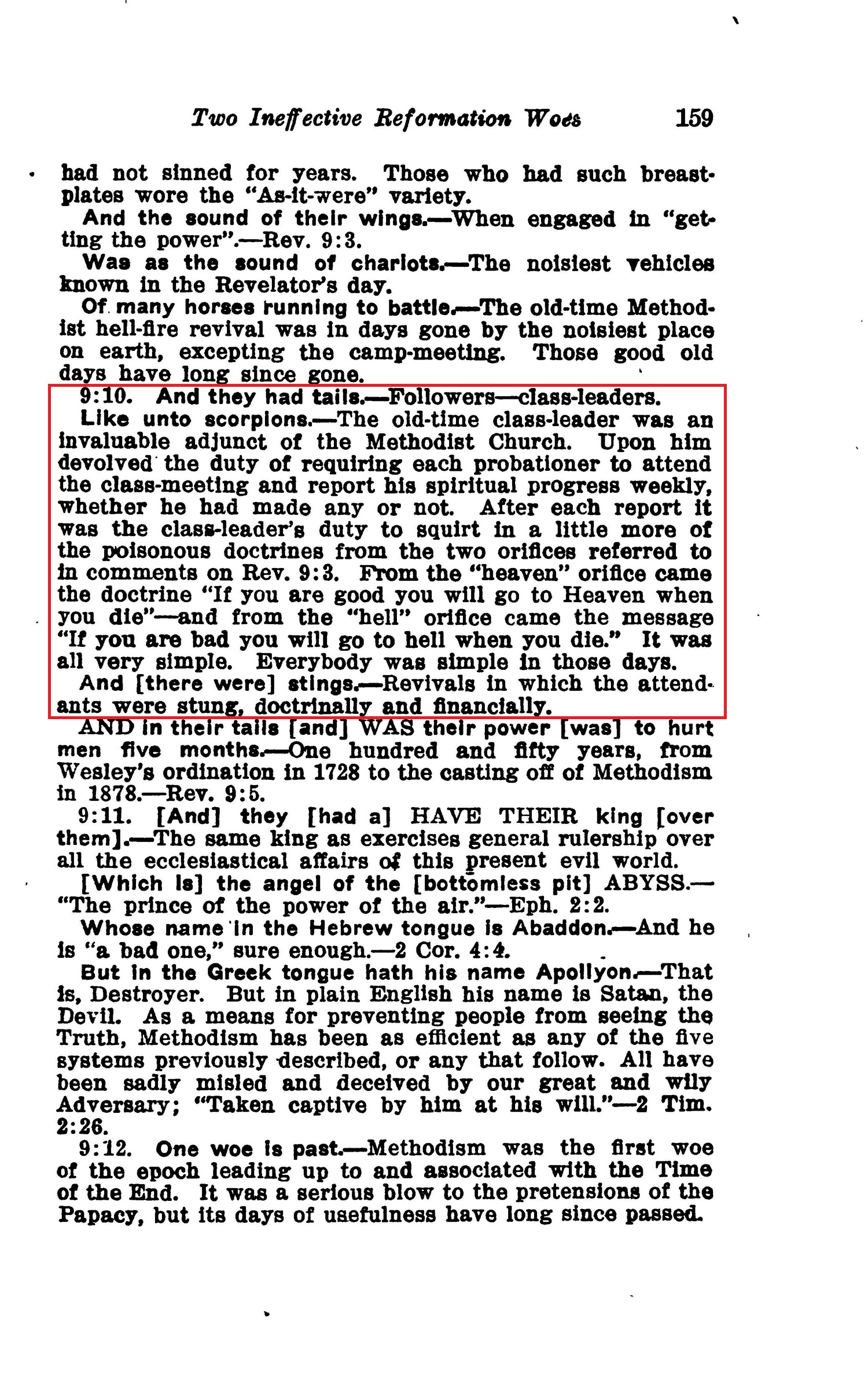 9:10. And they had tails. — Followers—class-leaders Like unto scorpions. — The old-time class-leader was an invaluable adjunct of the Methodist Church. Upon him devolved the duty of requiring each probationer to attend the class-meeting and report his spiritual progress weekly, whether he had made any or not After each report It was the class-leader's duty to squirt in a little more of the poisonous doctrines from the two orifices referred to In comments on Rev. 9:3. From the "heaven" orifice came the doctrine "If you are good you will go to Heaven when you die"—and from the "hell" orifice came the message "If you are bad you will go to hell when you die." It was all very simple. Everybody was simple In those days. And [there were] stings. — Revivals in which the attendants were stung, doctrinally and financially. Source : 🇺🇸 1917 - Studies in the Scriptures, Vol 7, The finished mystery, page 159 + Cover |