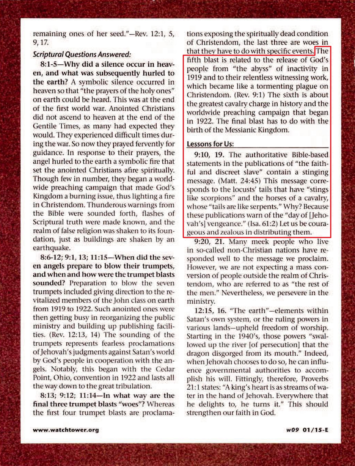 Lessons for Us: 9:10, 19. The authoritative Bible-based statements in the publications of "the faithful and discreet slave" contain a stinging message. (Matt. 24:45) This message corresponds to the locusts' tails that have "stings like scorpions" and the horses of a cavalry, whose "tails are like serpent." Why? Because these publications warn of the "day of [Jehovah] vengeance." (Isa. 61:2) Let us be courageous and zealous in distributing them. Source : 🇺🇸 The Watchtower, 01 15 2009, page 32 + Cover |