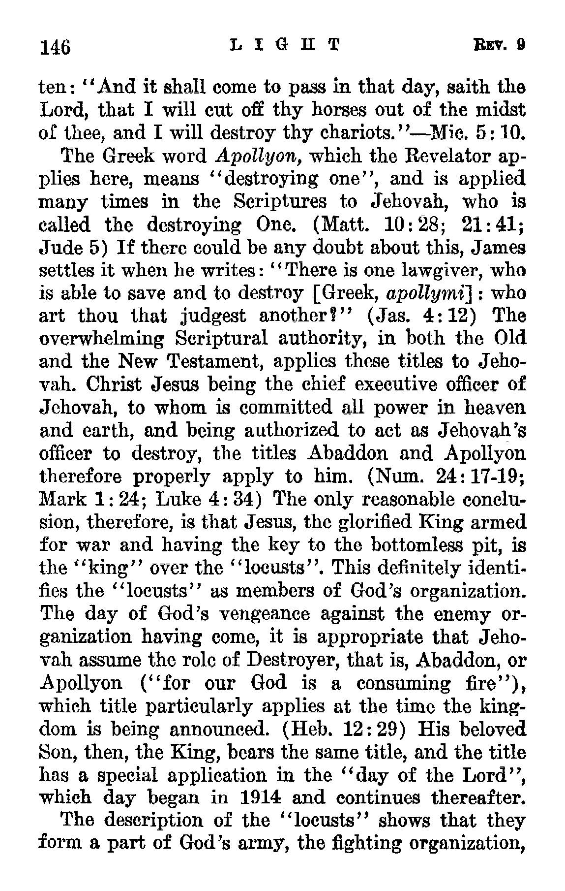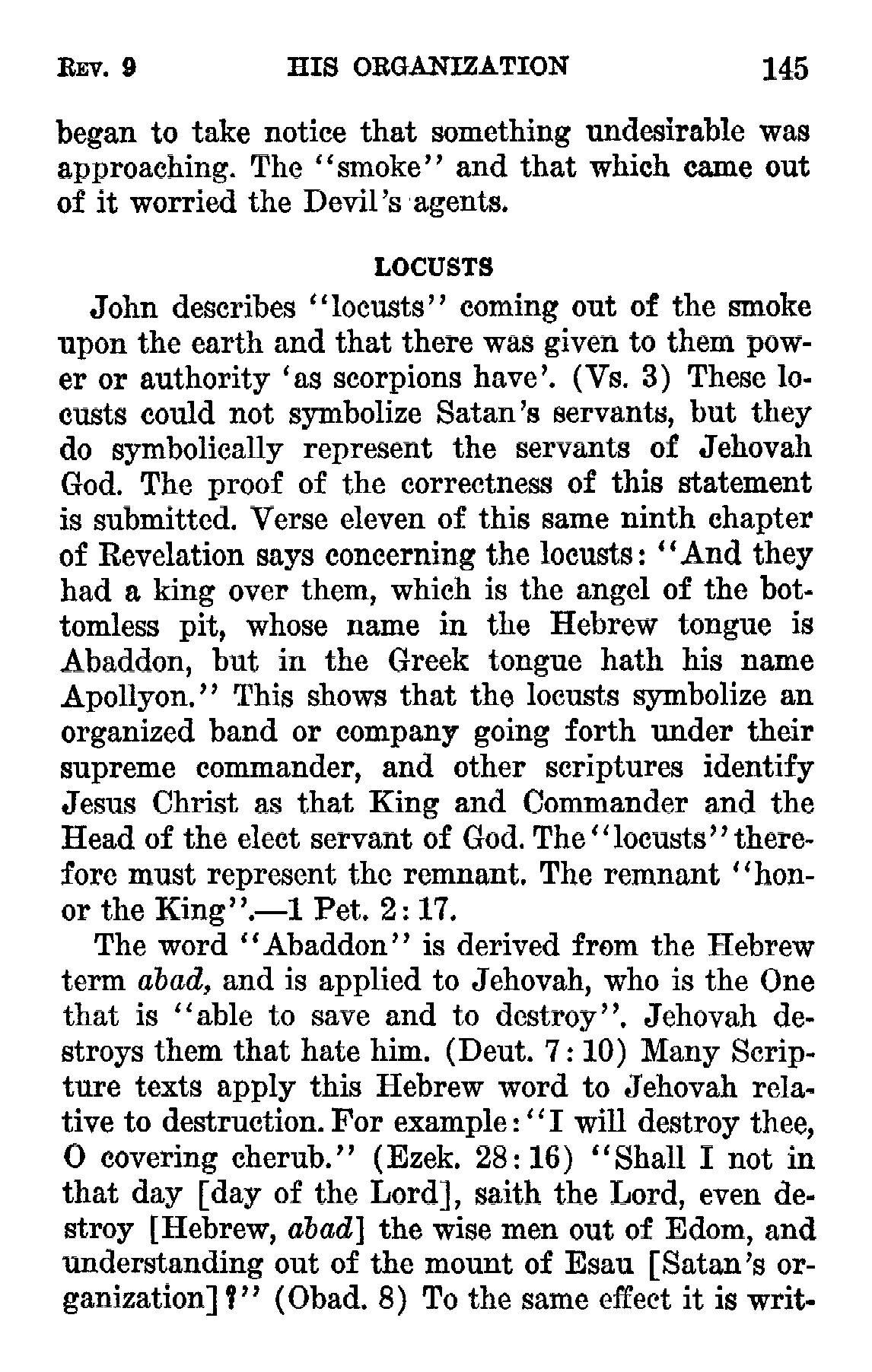Verse eleven of this same ninth chapter of Revelation says concerning the locusts: "And they had a king over them, which is the angel of the bottomless pit, whose name in the Hebrew tongue is Abaddon, but in the Greek tongue hath his name Apollyon." [...] The word "Abaddon" is derived from the Hebrew term abad, and is applied to Jehovah, who is the One that is "able to save and to destroy". Jehovah destroys them that hate him. (Deut. 7:10) Many Scripture texts apply this Hebrew word to Jehovah relative to destruction. For example: "I will destroy thee, o covering cherub." (Ezek. 28:16) "Shall I not in that day [day of the Lord], saith the Lord, even destroy [Hebrew, abad] the wise men out of Edom, and understanding out of the mount of Esau [Satan's organization] '" (Obad. 8) To the same effect it is written: "And it shall come to pass in that day, saith the Lord, that I will cut off thy horses out of the midst 01 thee, and I will destroy thy chariots.' '-Mic. 5:10. The Greek word Apollyon, which the Revelator applies here, means "destroying one", and is applied many times in the Scriptures to Jehovah, who is called the destroying One. (Matt. 10:28; 21:41; Jude 5) If there could be any doubt about this, James settles it when he writes: "There is one lawgiver, who is able to save and to destroy [Greek, apollymi] : who art thou that judgest another ?" (Jas. 4:12) The overwhelming Scriptural authority, in both the Old and the New Testament, applies these titles to Jehovah. Christ Jesus being the chief executive officer of Jehovah, to whom is committed all power in heaven and earth, and being authorized to act as Jehovah's officer to destroy, the titles Abaddon and Apollyon therefore properly apply to him. (Num. 24:17-19; Mark 1: 24; Luke 4: 34) The only reasonable conclusion, therefore, is that Jesus, the glorified King armed for war and having the key to the bottomless pit, is the "king" over the "locusts". This definitely identifies the "locusts" as members of God's organization. The day of God's vengeance against the enemy organization having come, it is appropriate that Jehovah assume the role of Destroyer, that is, Abaddon, or Apollyon ("for our God is a consuming fire"), which title particularly applies at the time the kingdom is being announced. (Heb. 12:29) His beloved Son, then, the King, bears the same title, and the title has a special application in the "day of the Lord", which day began in 1914 and continues thereafter. Source : 🇺🇸 1930 - Light, Vol 1, page 145, page 146 + Cover |