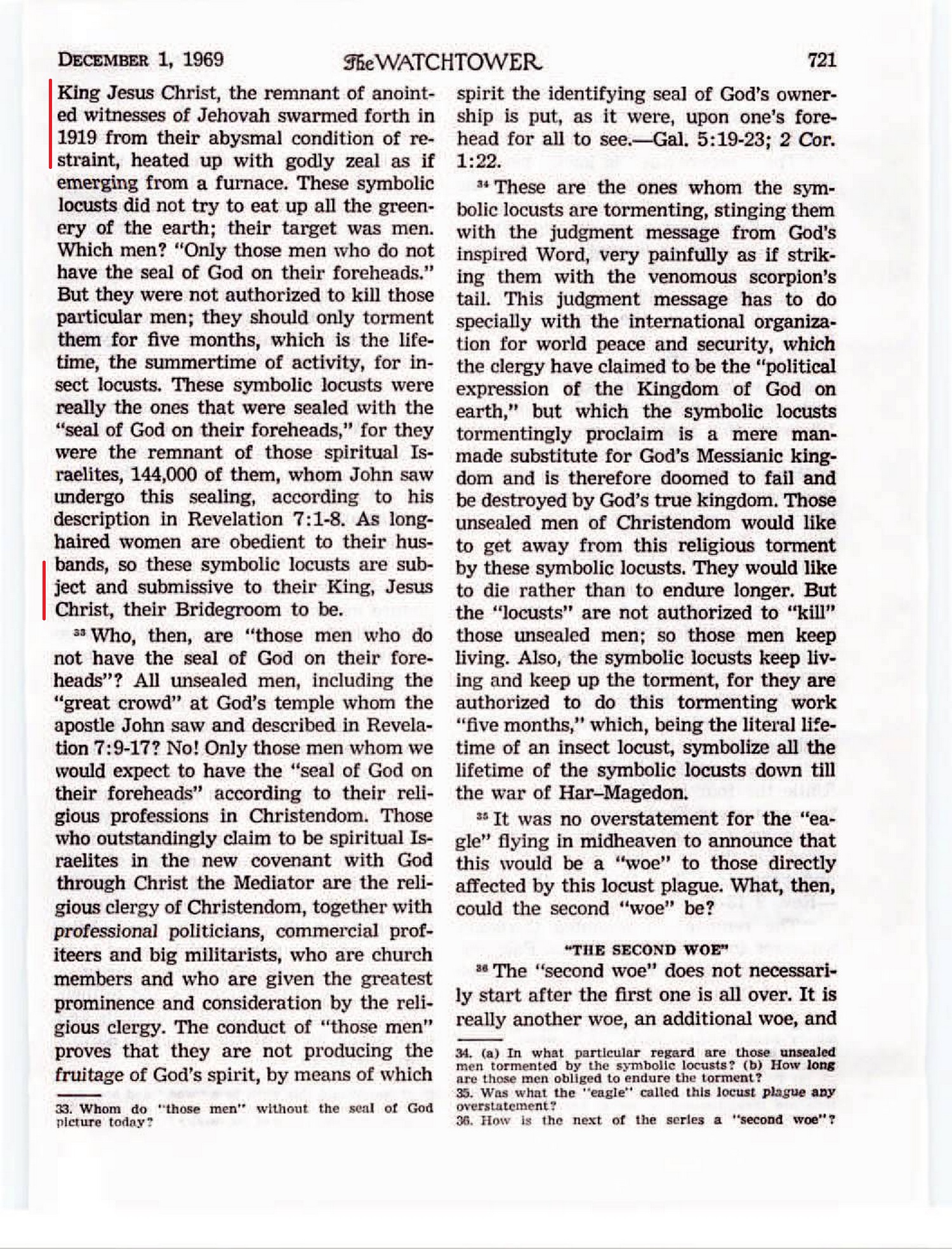 Under command of their heavenly King Jesus Christ, the remnant of anointed witnesses of Jehovah swarmed forth in 1919 from their abysmal condition of restraint [...] so these symbolic locusts are subject and submissive to their King, Jesus Christ, their Bridegroom to be. Source : 🇺🇸 The Watchtower, December 1 1969, page 720, page 721 + Cover |