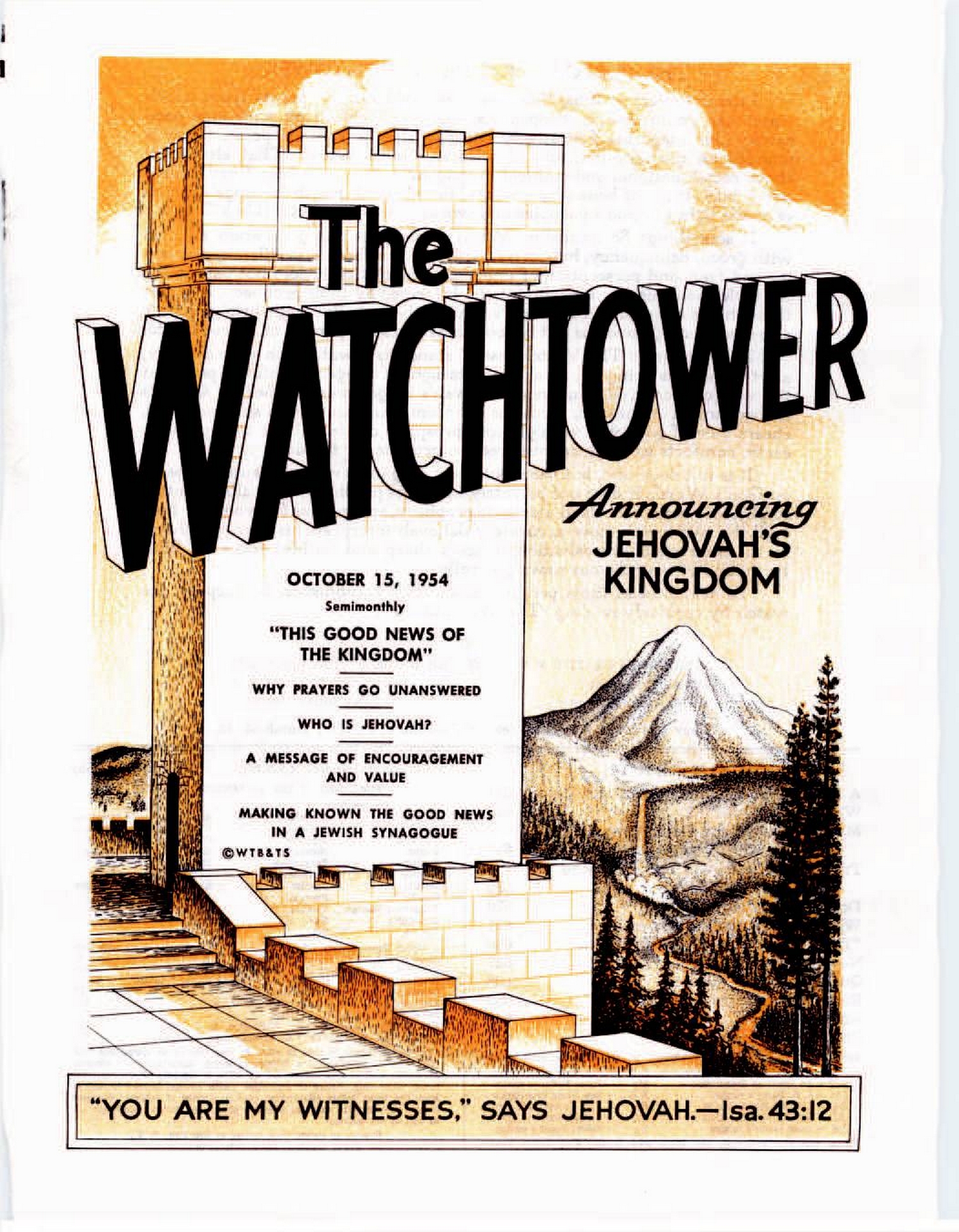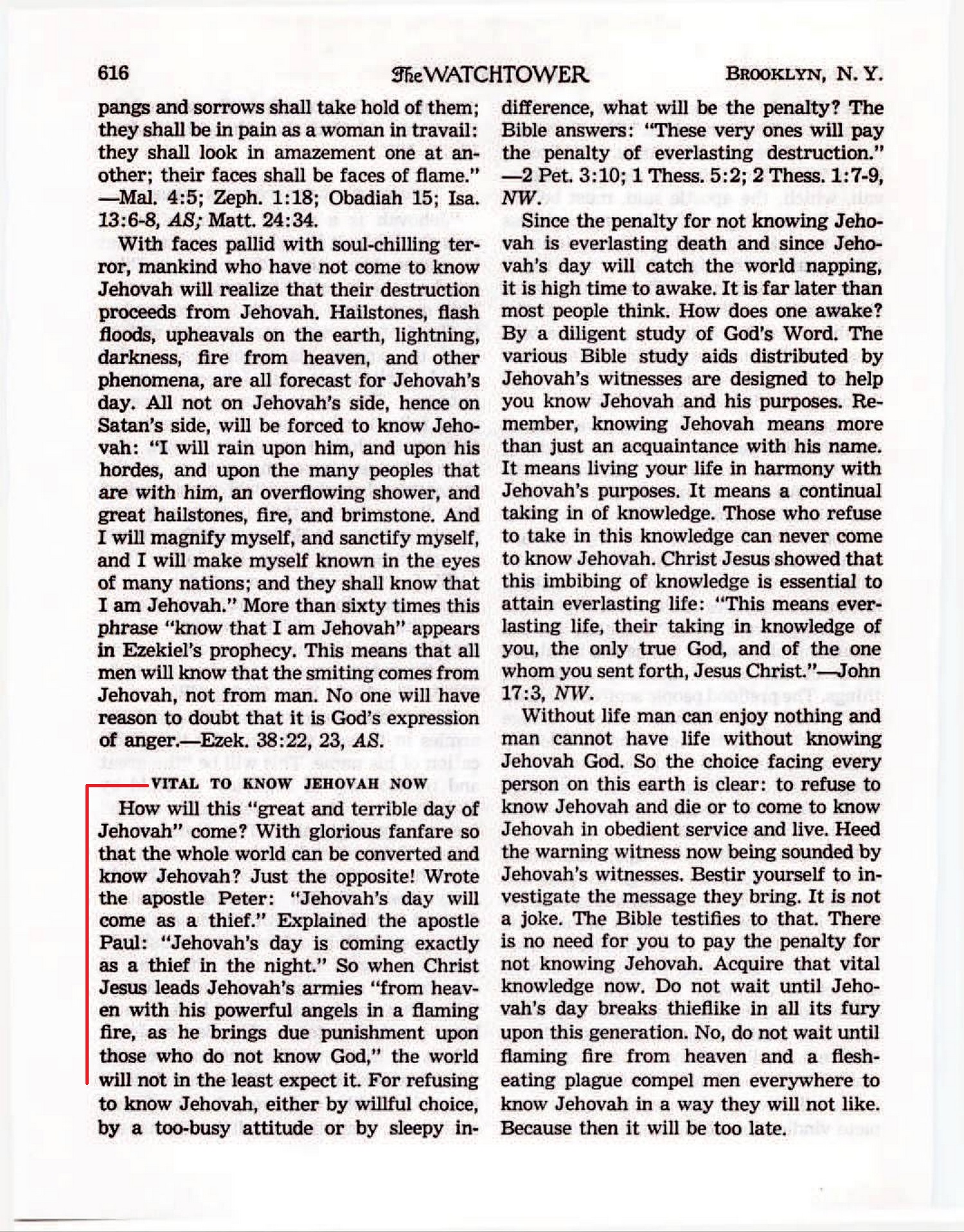 Jehovah is Commanderin-Chief of heavenly armies that will be used to express his anger against this world. Christ Jesus leads Jehovah’s armies to battle: “The armies that were in heaven were following him on white horses, and they were clothed in white, clean, fine linen.” Do we have any idea as to the strength and number of Jehovah’s armies? Yes! Remembering that it took only two angels to blot out Sodom and Gomorrah, we get some idea from Revelation 9:16 (NW, footnote) why Armageddon will be the greatest tribulation that has ever come upon this world: “‘The number of the armies of the horsemen was twenty thousand times ten thousand,’ that is, 200,000,- 000” !—Ex. 15:3; Rev. 19:14, When Jehovah gives the command the armies in heaven will fight for the vindication of his name. This will be “the great and terrible day of Jehovah” [...] So when Christ Jesus leads Jehovah’s armies “from heaven with his powerful angels in a flaming fire, as he brings due punishment upon those who do not know God,” the world will not in the least expect it. Source : 🇺🇸 The Watchtower, October 15 1954, page 615, page 616 + Cover |