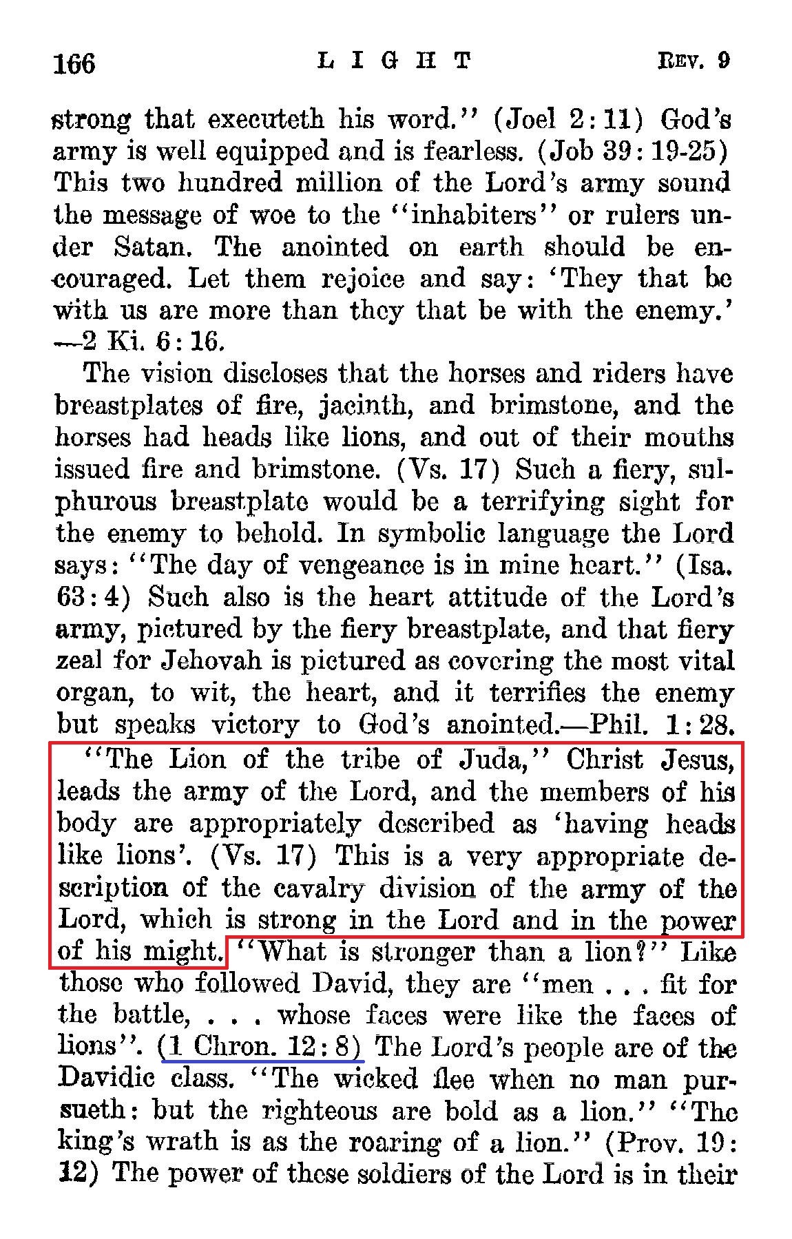 "The Lion of the tribe of Juda," Christ Jesus, leads the army of the Lord, and the members of his body are appropriately described as 'having heads like lions'. (Vs, 17) This is a very appropriate description of the cavalry division of the army of the Lord, which is strong in the Lord and in the power of his might. "What is stronger than a lion?" Like those who followed David, they are "men ... fit for the battle,... whose faces were like the faces of lions". (1 Chron. 12:8)