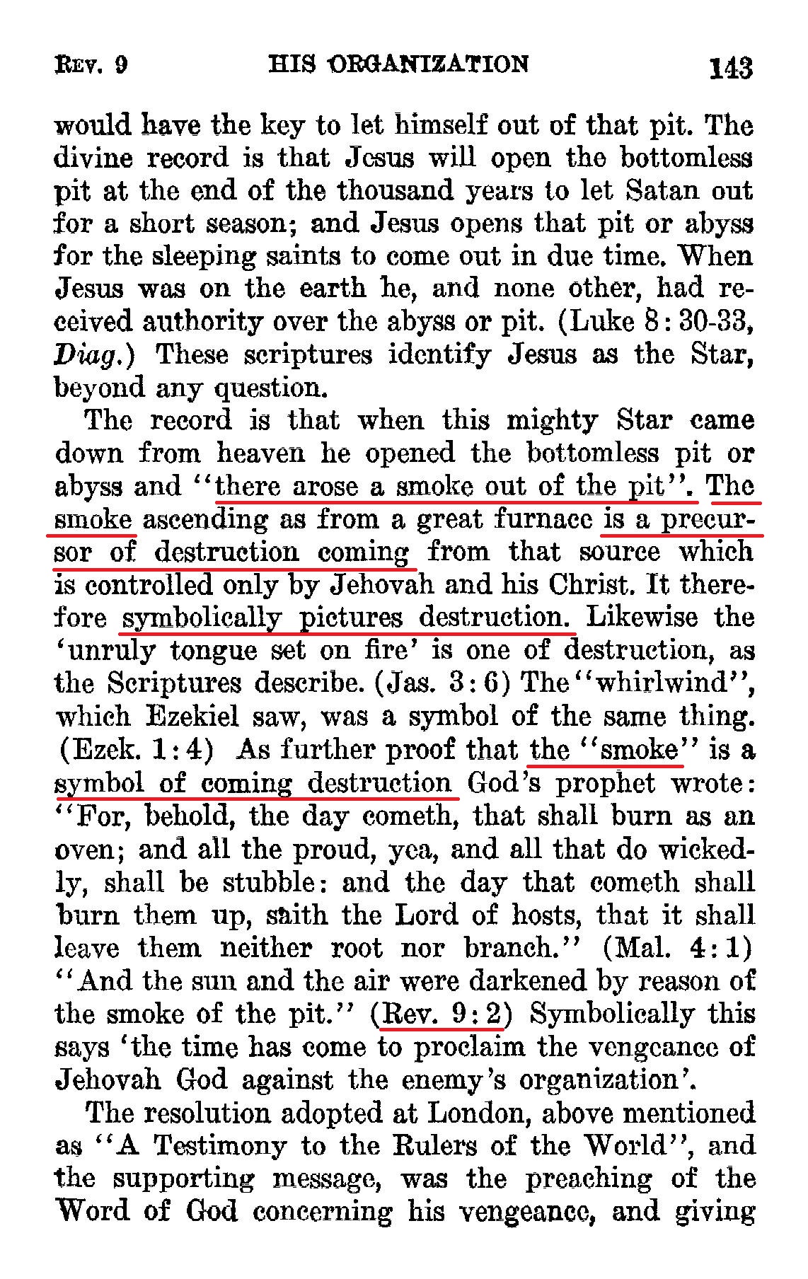 The record is that when this mighty Star came down from heaven he opened the bottomless pit or abyss and "there arose a smoke out of the pit". The smoke ascending as from a great furnace is a precursor of destruction coming from that source which is controlled only by Jehovah and his Christ. It therefore symbolically pictures destruction. Likewise the 'unruly tongue set on fire' is one of destruction, as the Scriptures describe. (Jas. 3:6) The "whirlwind", which Ezekiel saw, was a symbol of the same thing. (Ezek. 1:4) As further proof that the "smoke" is a symbol of coming destruction God's prophet wrote: "For, behold, the day cometh, that shall burn as an oven; and all the proud, yea, and all that do wickedly, shall be stubble: and the day that cometh shall burn them up, saith the Lord of hosts, that it shall leave them neither root nor branch." (Mal. 4:1) "And the sun and the air were darkened by reason of the smoke of the pit." (Rev. 9:2) Symbolically this says 'the time has come to proclaim the vengeance of Jehovah God against the enemy's organization'. Source : 🇺🇸 1930 - Light, vol 1, page 143 + Cover |