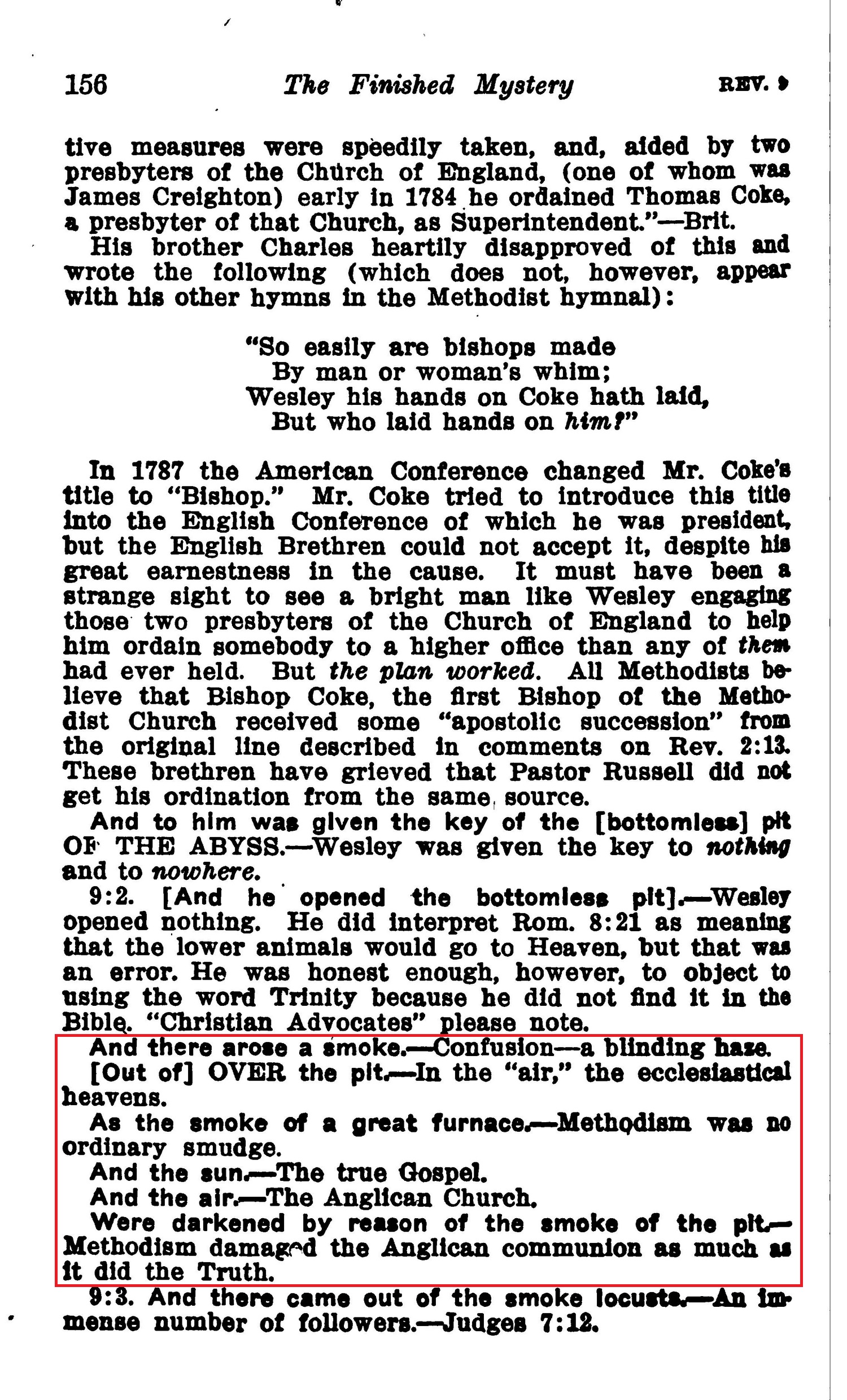 And there arose a smoke. — Confusion — a blinding base. [Out of] OVER the pit. — In the "air," the ecclesiastical heavens. As the smoke of a great furnace. — Methodism was no ordinary smudge. And the sun,—The true Gospel. And the air. — The Anglican Church. Were darkened by reason of the smoke of the pit - Methodism damaged the Anglican communion as much as it did the Truth. Source : 🇺🇸 1917 - Studies in the Scriptures, Vol 7, The finished mystery, page 156 + Cover |