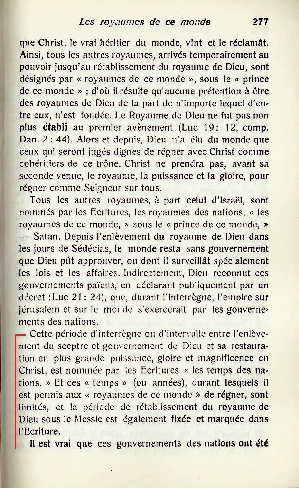Cette période d'interrègne ou d'intervalle entre l'enlèvement du sceptre et gouvernement de Dieu et sa restauration en plus grande puissance, gloire et magnificence en Christ, est nommée par les Ecritures "les temps des nations." Et ces "temps" (ou années), durant lesquels il est permis aux "royaumes de ce monde" de régner, sont limités, et la période de rétablissement du royaume de Dieu sous le Messie est également fixée et marquée dans l'Ecriture.