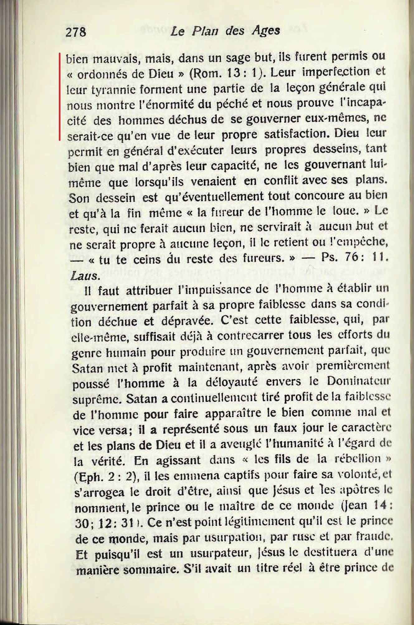 Il est vrai que ces gouvernements des nations ont été bien mauvais, mais, dans un sage but, ils furent permis ou "ordonnés de Dieu" (Rom. 13:1). Leur imperfection et leur tyrannie forment une partie de la leçon générale qui nous montre l'énormité du péché et nous prouve l'incapacité des hommes déchus de se gouverner eux-mêmes, ne serait-ce qu'en vue de leur propre satisfaction. Source : 🇫🇷 1886 - Etudes dans les Ecritures, Vol 1, Le Divin Plan Des Ages, page 277, page 278 + Cover |