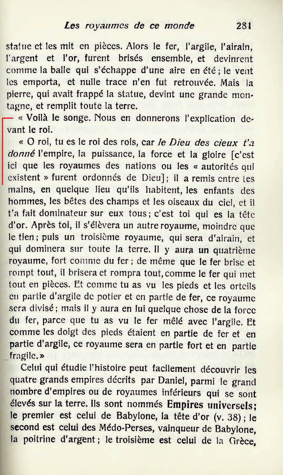 « Voilà le songe. Nous en donnerons l'explication devant le roi. « O roi, tu es le roi des rois, car le Dieu des cieux t'as donné l'empire, la puissance, la force et la gloire [c'est ici que les royaumes des nations ou les « autorités qui existent » furent ordonnés de Dieu]; Source : 🇫🇷 1886 - Etudes dans les Ecritures, Vol 1, Le Divin Plan Des Ages, page 280, page 281 + Cover |