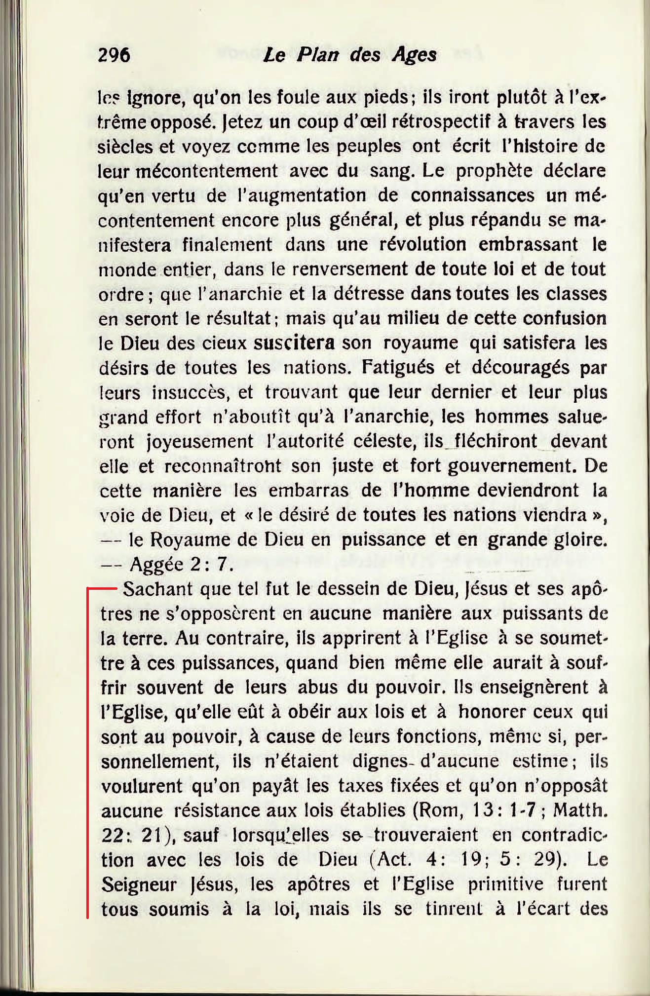 Sachant que tel fut le dessein de Dieu, Jésus et ses apôtres ne s'opposèrent en aucune manière aux puissants de la terre. Au contraire, ils apprirent à l'Eglise à se soumettre à ces puissances, quand bien même elle aurait à souffrir souvent de leurs abus du pouvoir. Ils enseignèrent à l'Eglise, qu'elle eût à obéir aux lois et à honorer ceux qui sont au pouvoir, à cause de leurs fonctions, même si, personnellement, ils n'étaient dignes- d'aucune estime; ils voulurent qu'on payât les taxes fixées et qu'on n'opposât aucune résistance aux lois établies (Rom, 13:1-7; Matth. 22:, 21), sauf lorsqu'elles se- trouveraient en contradiction avec les lois de Dieu (Act. 4:19; 5:29). Le Seigneur Jésus, les apôtres et l'Eglise primitive furent tous soumis à la loi, mais ils se tinrent à l'écart des gouvernements de ce monde et n'y prirent aucune part. Il est vrai que les puissances qui subsistent (les gouvernements de ce monde) furent établies ou ordonnées par Dieu, afin que le genre humain pût acquérir l'expérience nécessaire sous leur règne, mais l'Eglise des fidèles qui aspirent à une position dans le Royaume à venir de Dieu, ne doit convoiter aucun honneur, elle ne doit pas recevoir de traitements dans les royaumes de ce monde et elle ne doit pas s'opposer à ces pouvoirs. [...] Sachant que le dessein de Dieu est de laisser le monde faire l'essai de se gouverner lui-même par ses propres forces, la vraie Eglise, tout en étant dans le monde, ne devrait point être du monde.