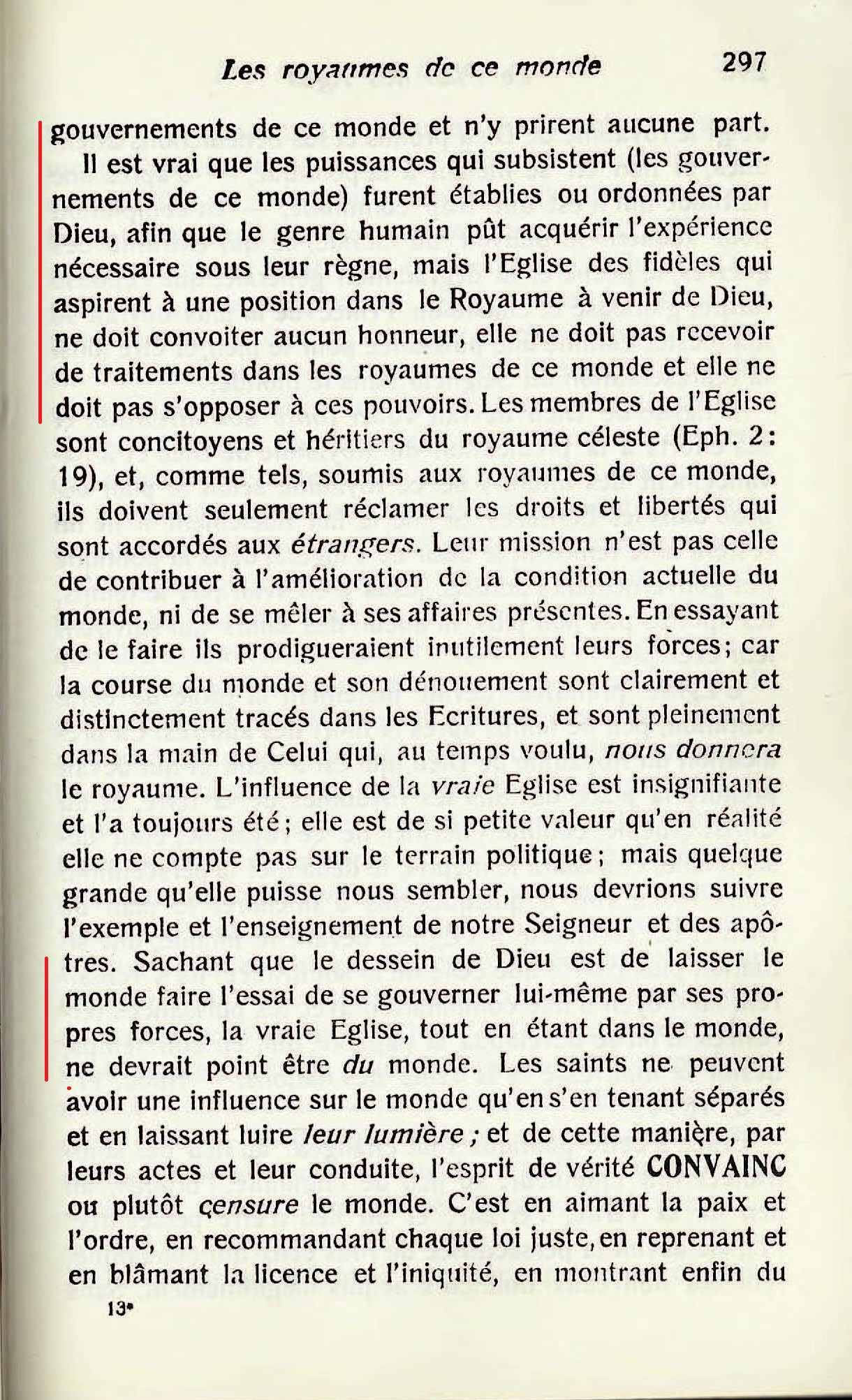 Il est donc du devoir de l’Eglise..., de se tenir séparée des royaumes de ce monde... Les chrétiens devraient reconnaître la vraie nature de ces royaumes et s’en tenir séparés, tout en leur rendant le respect et l’obéissance qui leur sont dûs, parce que Dieu leur a permis de gouverner. Comme l’enseigne l’apôtre Paul: « Que toute personne soit soumise aux autorités supérieures car il n’y a point d’autorité qui ne vienne de Dieu.» Romains 13:1